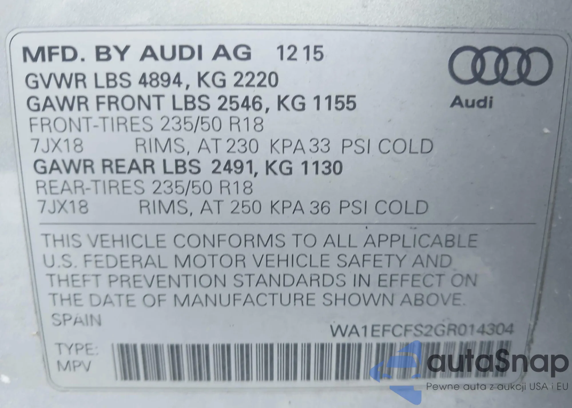 LOT: 43577821 VIN: WA1EFCFS2GR014304