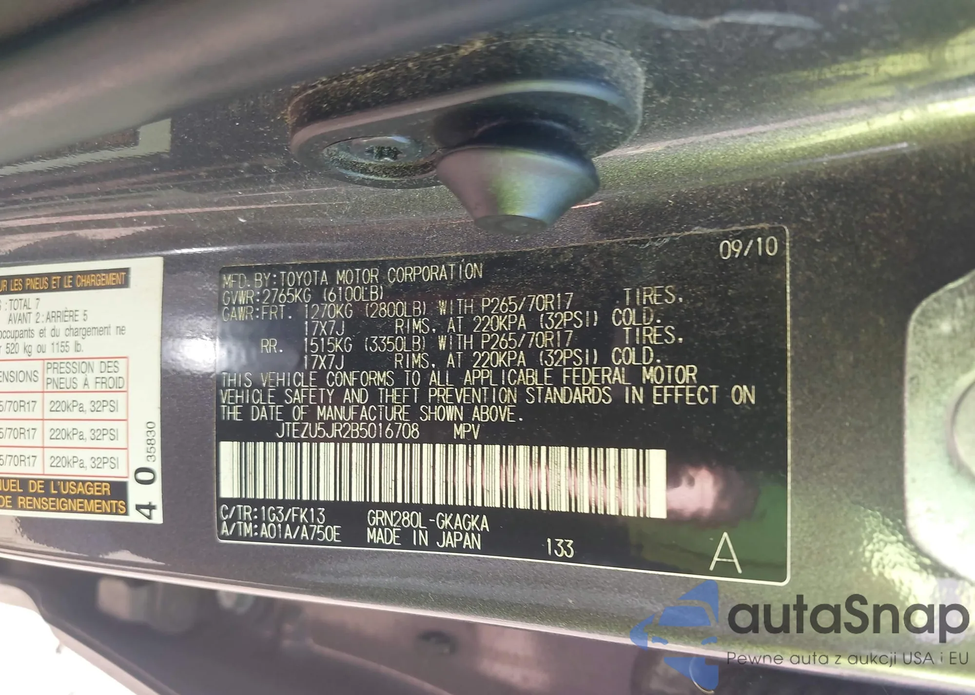 LOT: 43635587 VIN: JTEZU5JR2B5016708