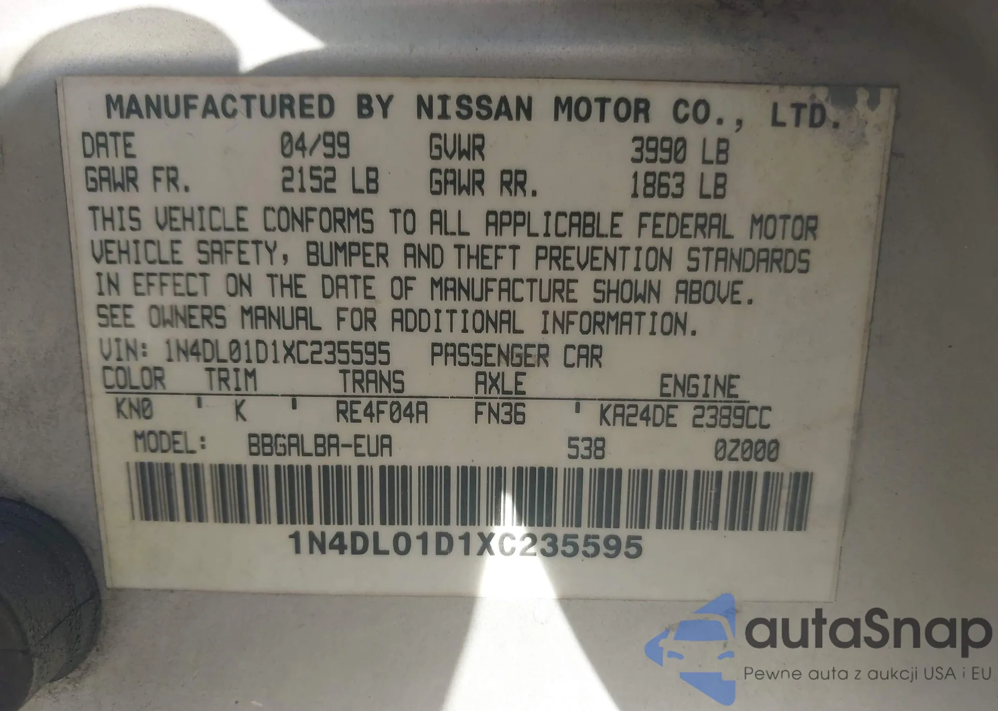 LOT: 43693577 VIN: JNRDR07X41W102958