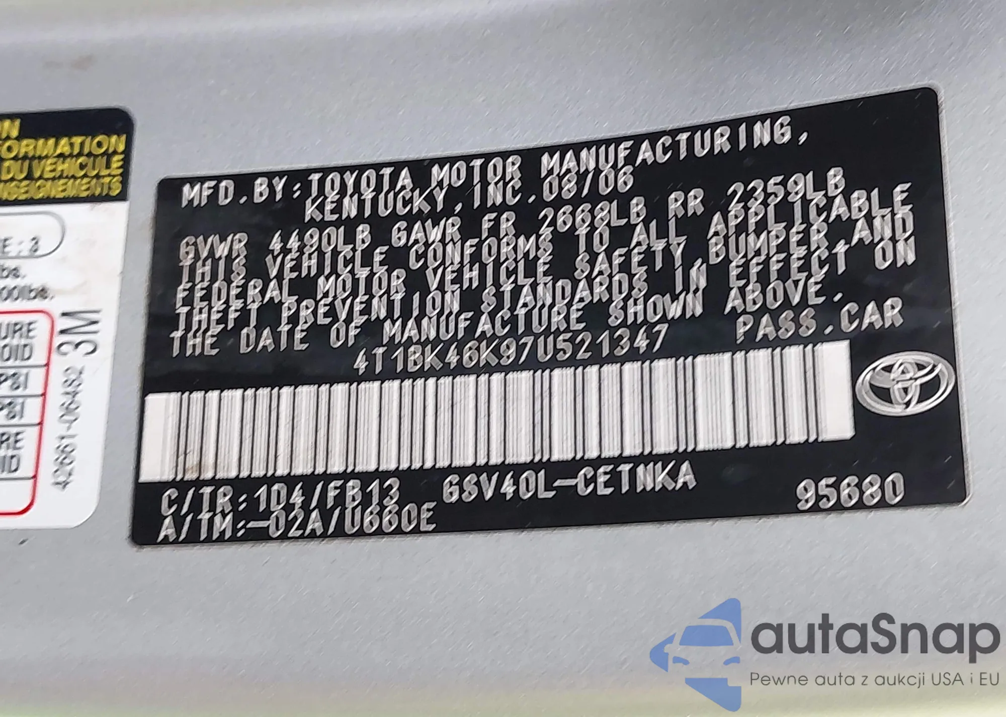 LOT: 43727959 VIN: 4T1BK46K97U521347