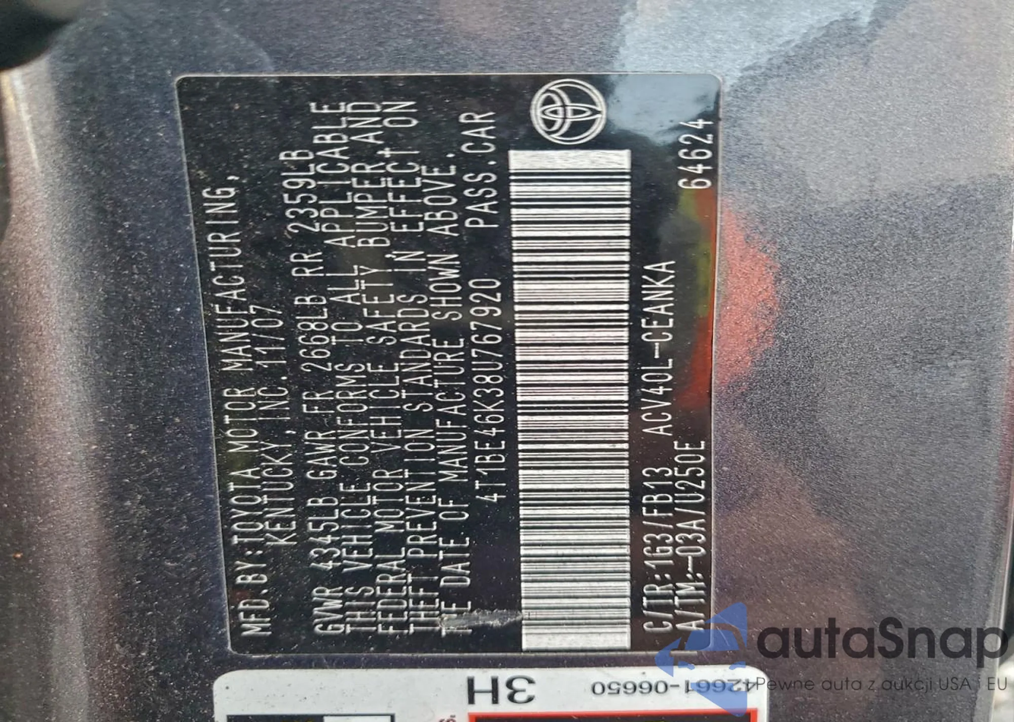 LOT: 96205875 VIN: 4T1BE46K38U767920