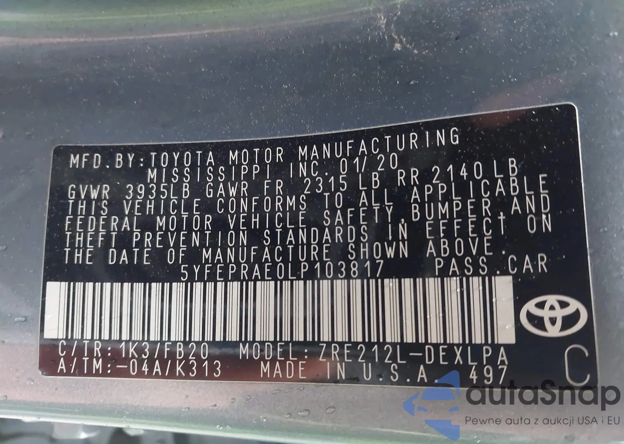 LOT: 43712932 VIN: 5YFEPRAE0LP103817