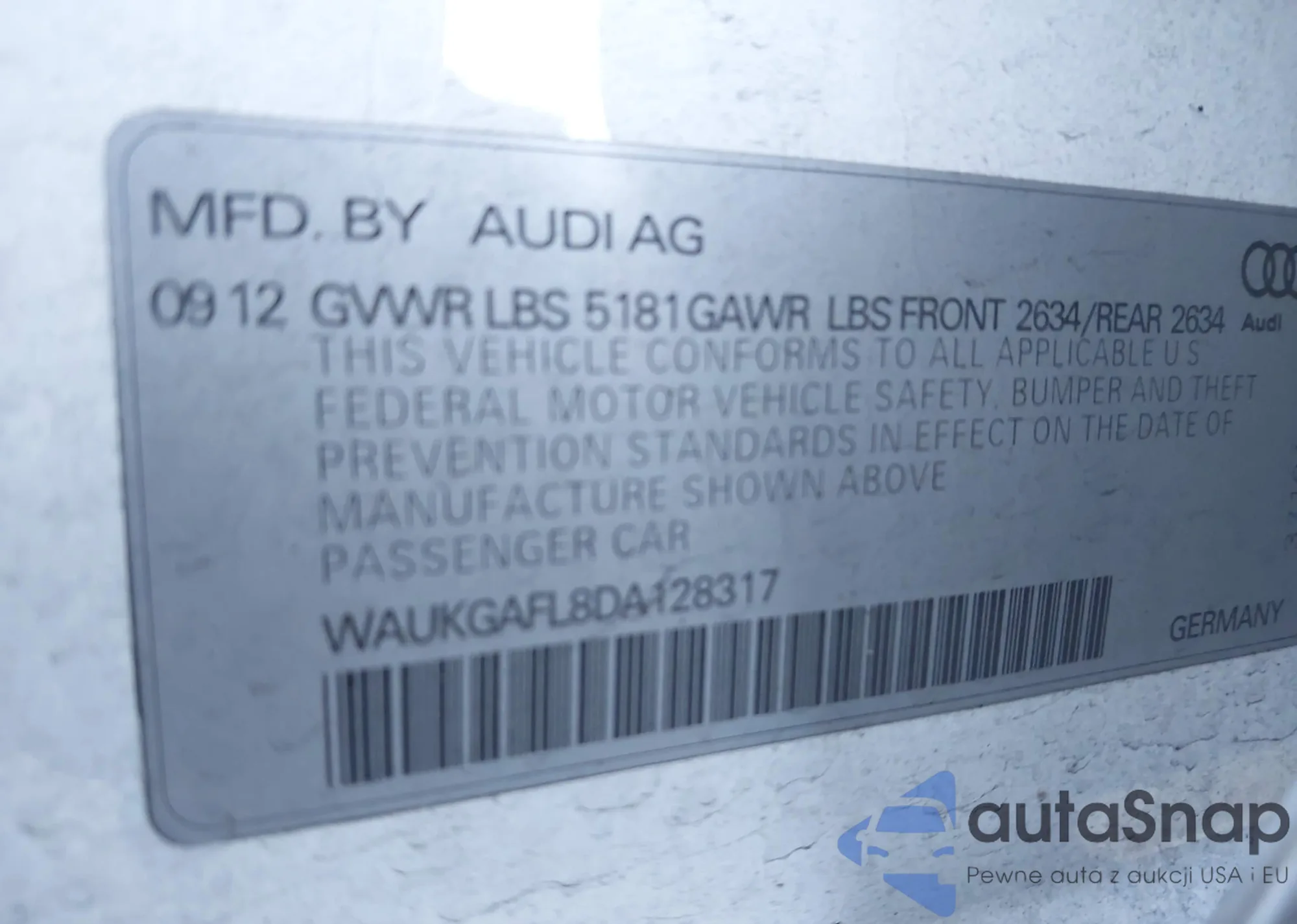 • VIN WAUKGAFL8DA128317