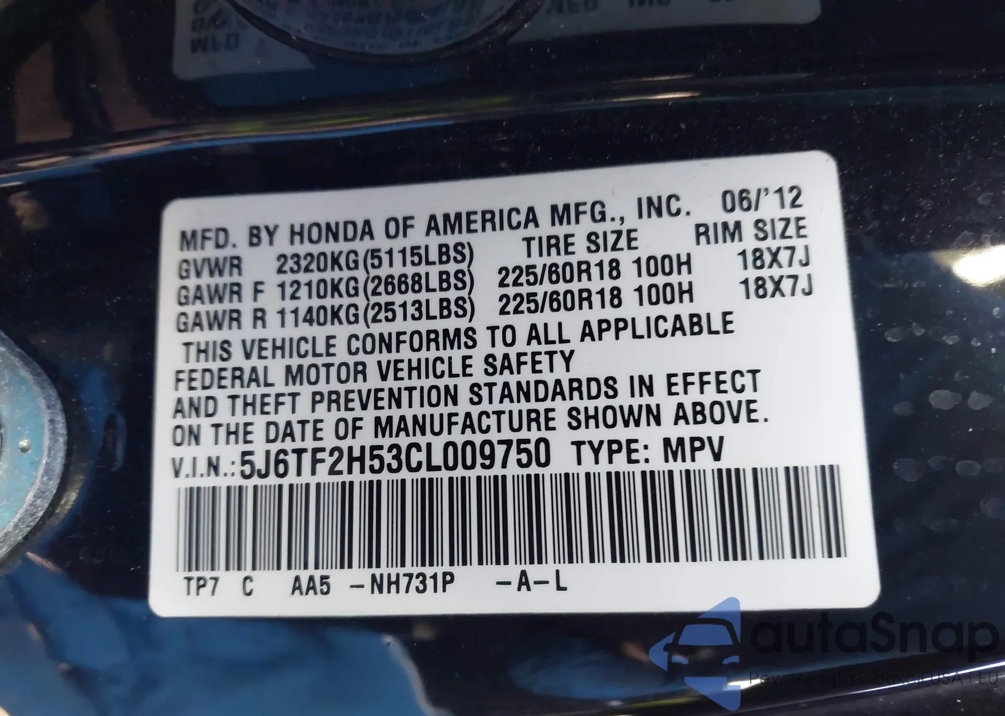 • VIN 5J6TF2H53CL009750