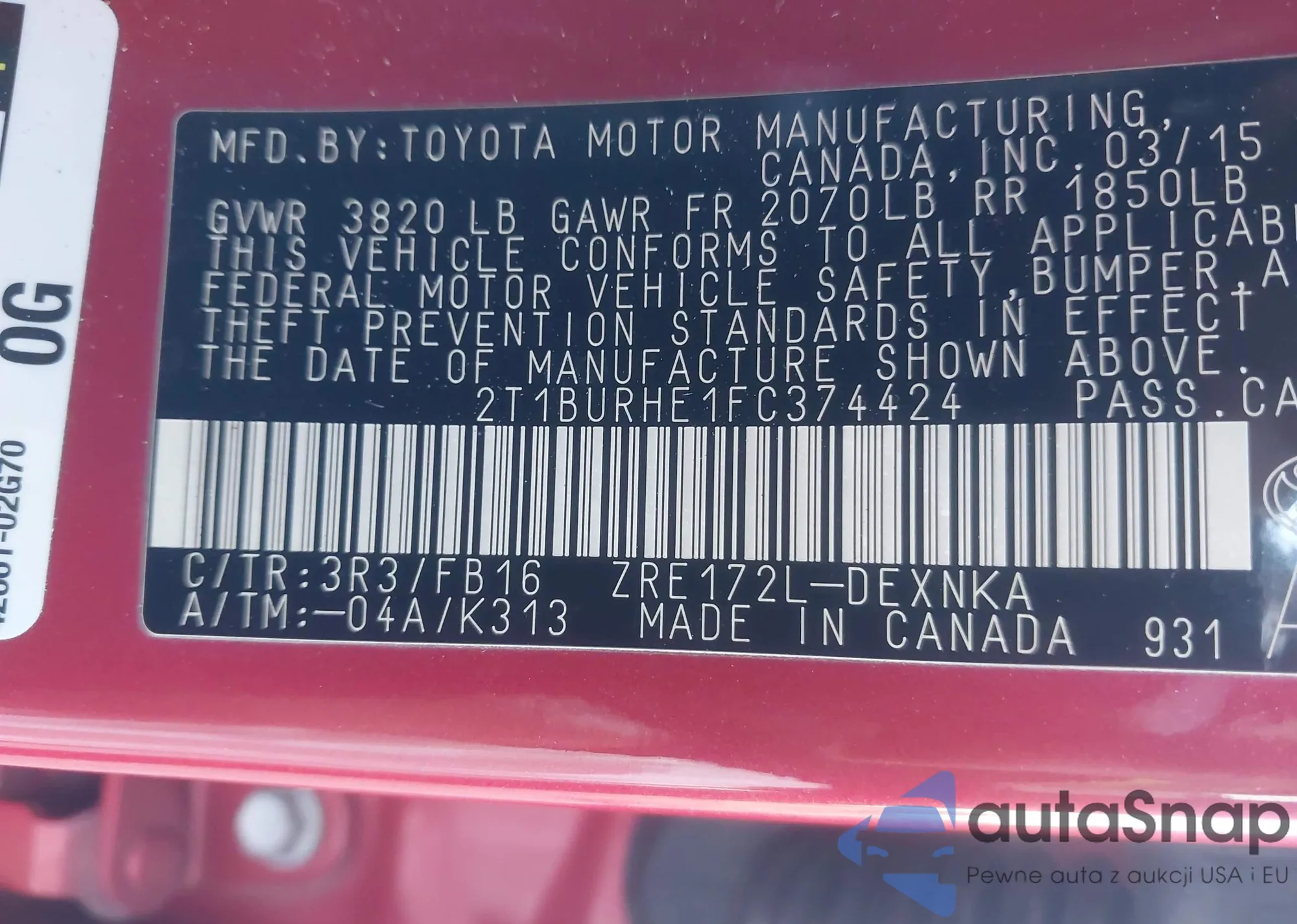 • VIN 2T1BURHE1FC374424