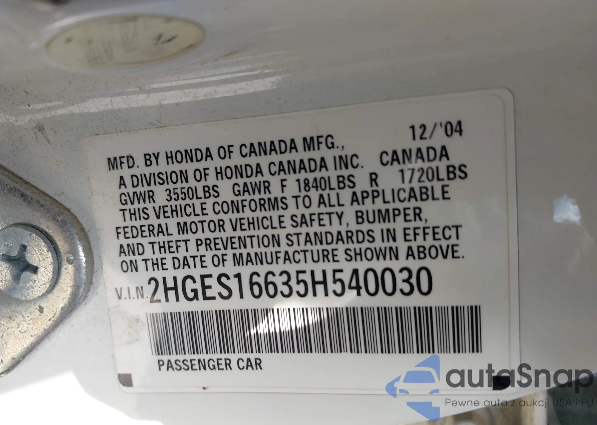 LOT: 43670080 VIN: 2HGES16635H540030