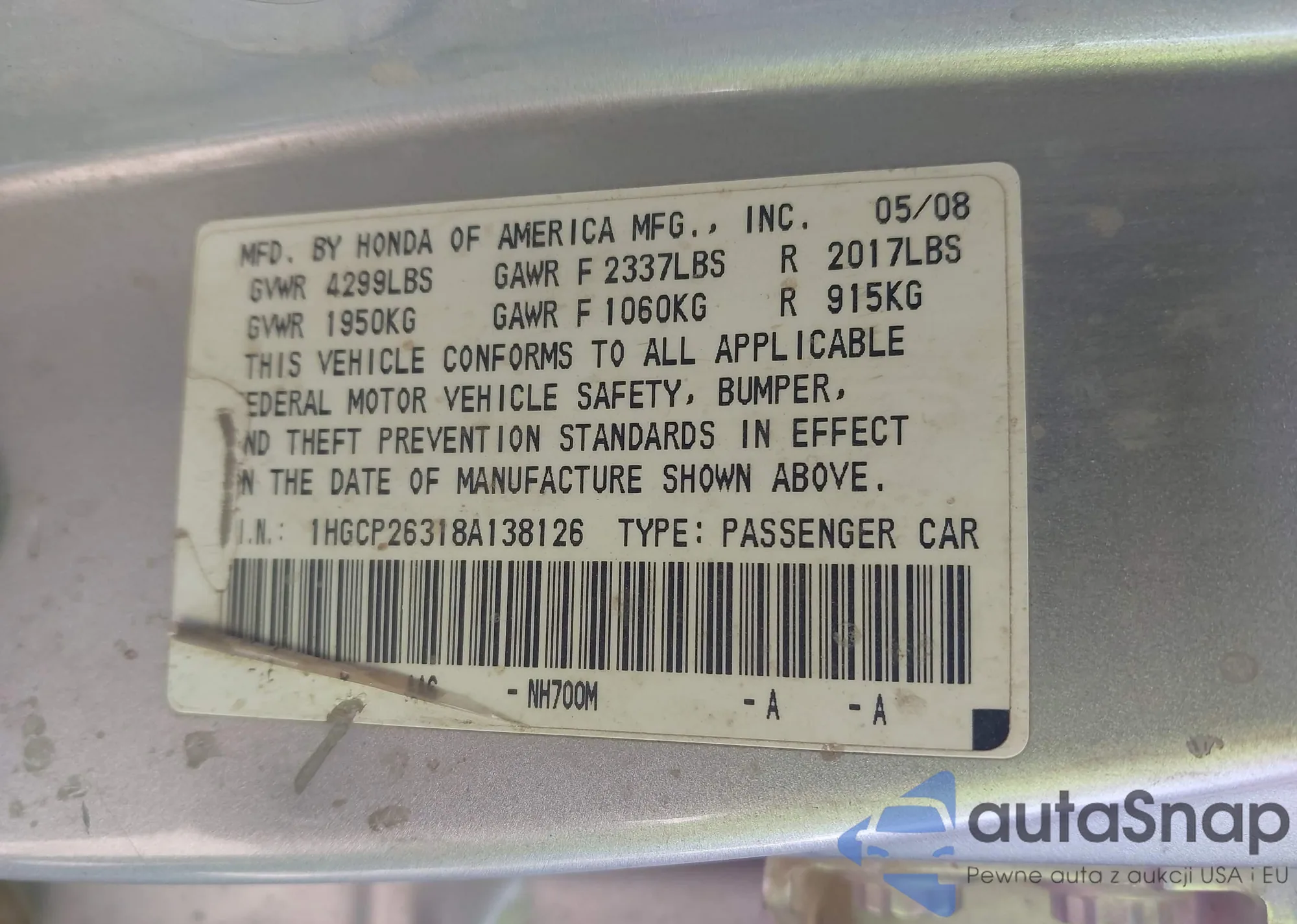 LOT: 43634922 VIN: 1HGCP26318A138126