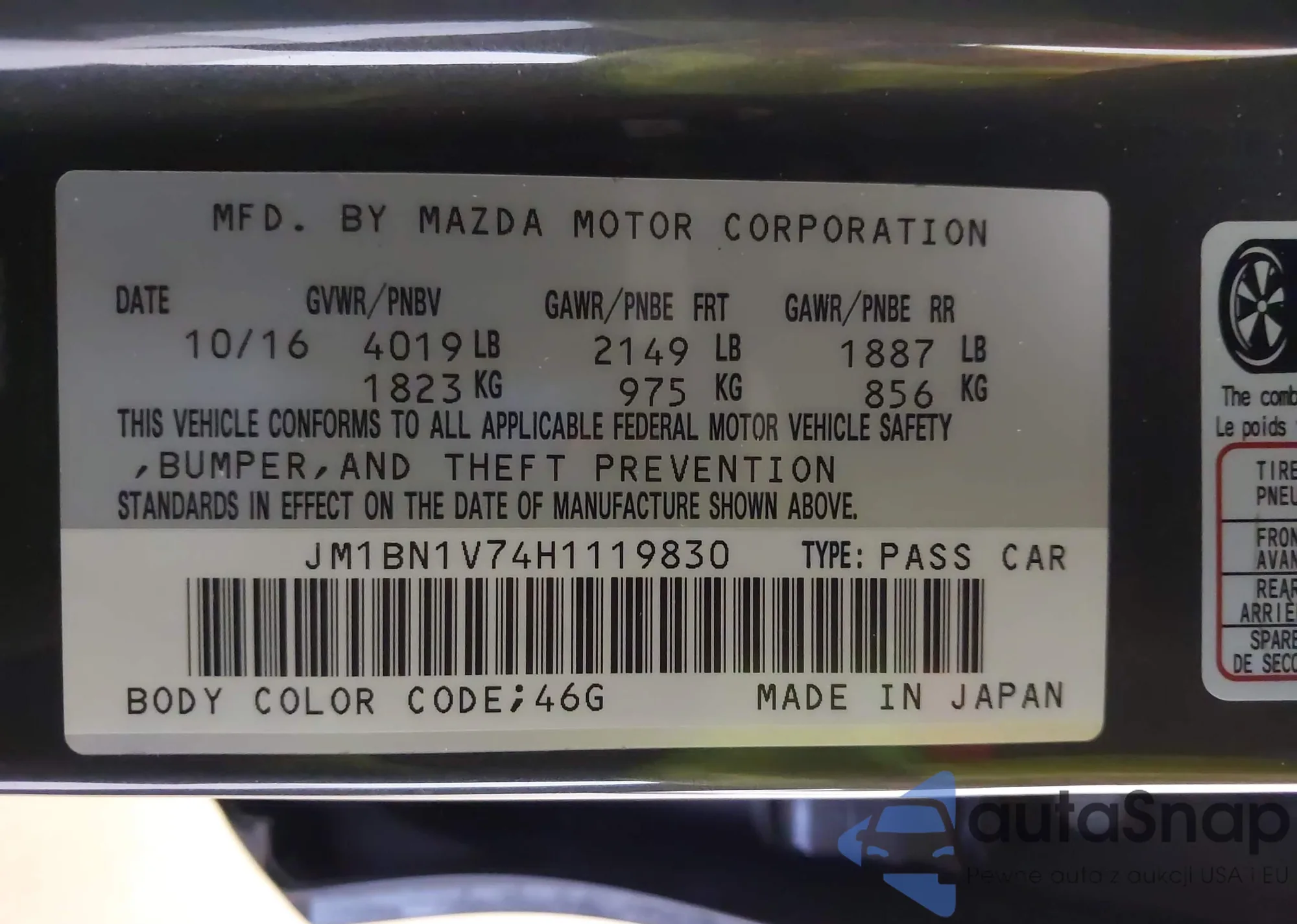 LOT: 43756926 VIN: JM1BN1V74H1119830