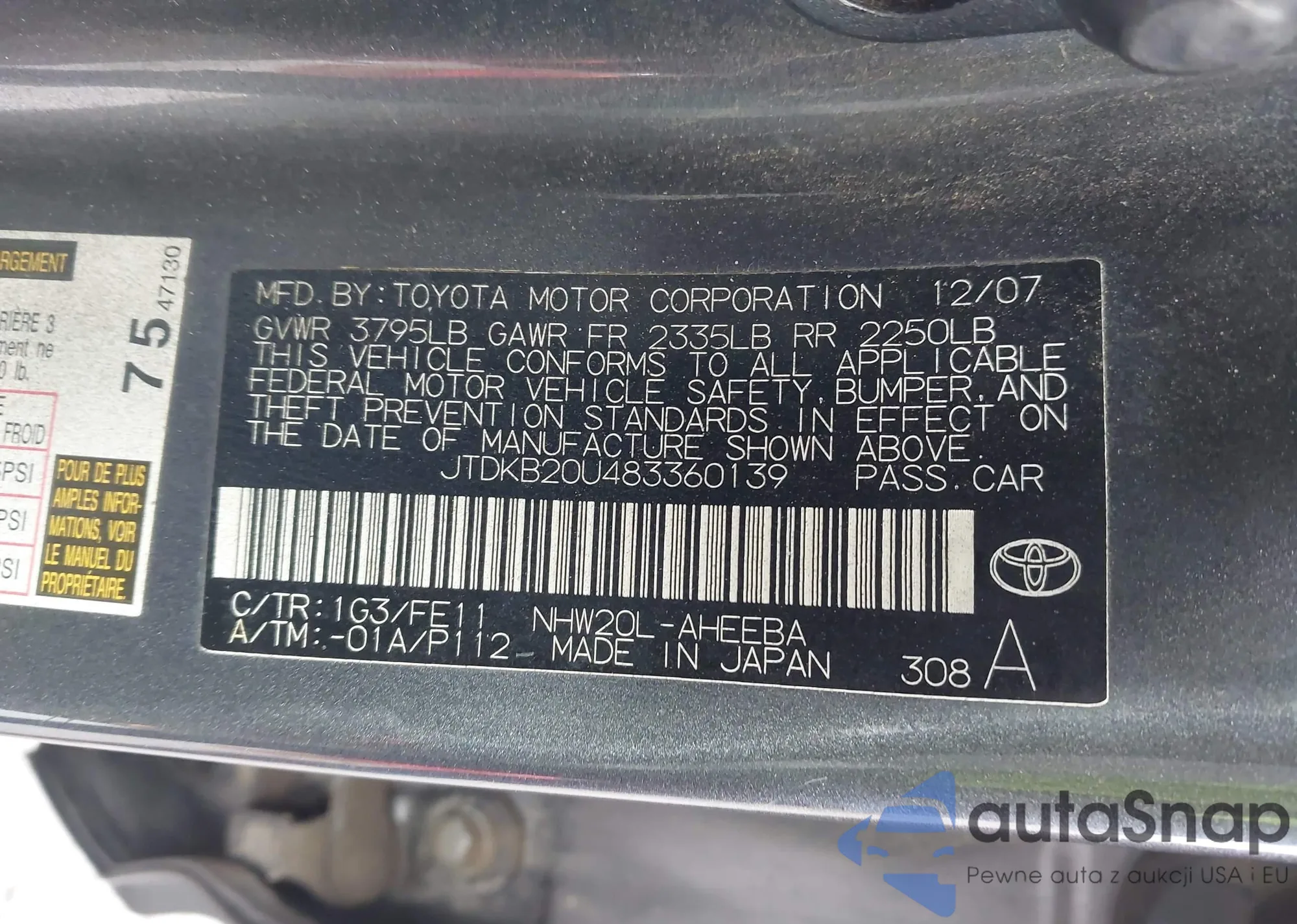 LOT: 43848439 VIN: JTDKB20U483360139