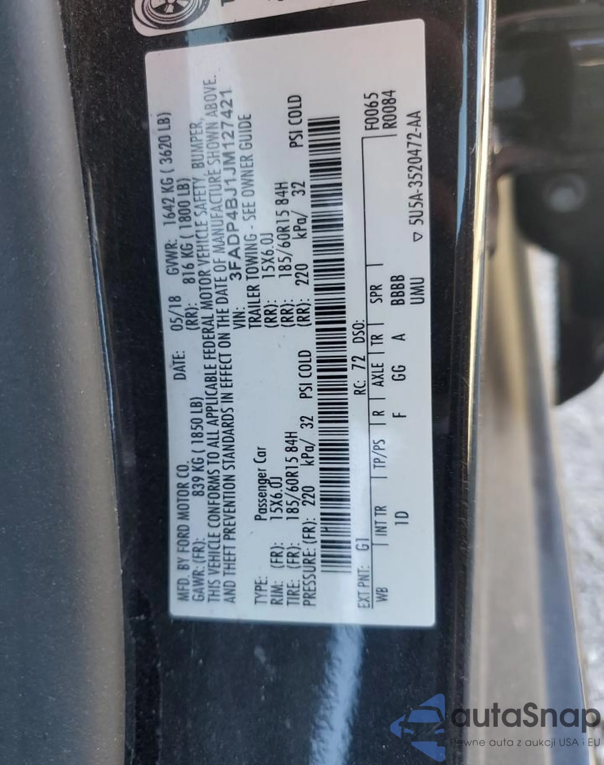 LOT: 85667775 VIN: 3FADP4BJ1JM127421