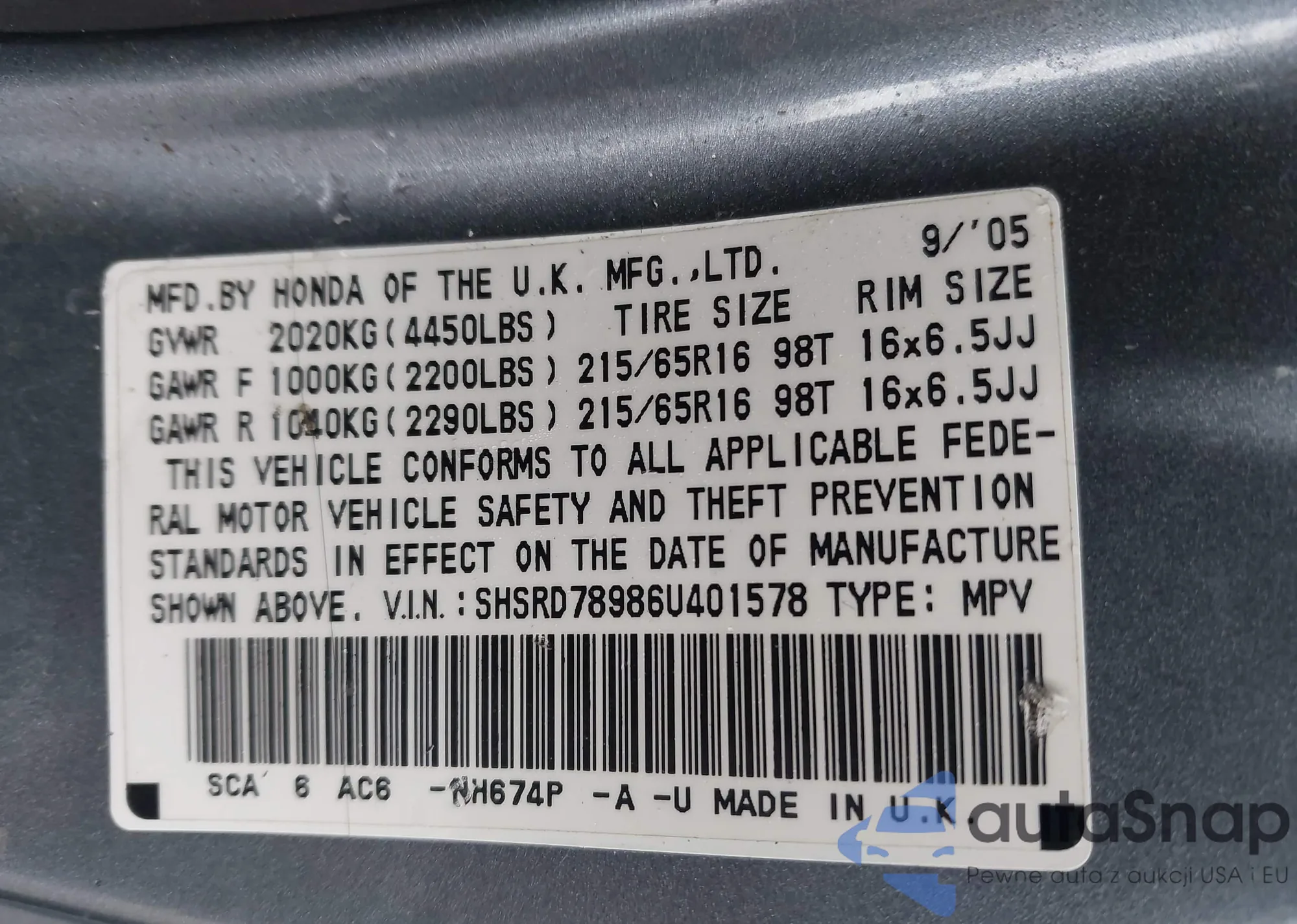 LOT: 43661060 VIN: SHSRD78986U401578