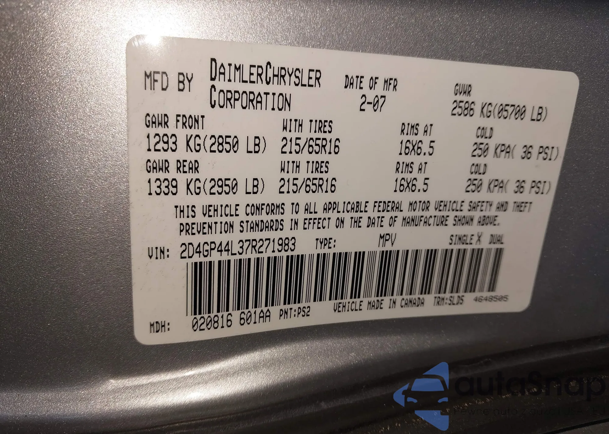 LOT: 43731158 VIN: 2D4GP44L37R271983