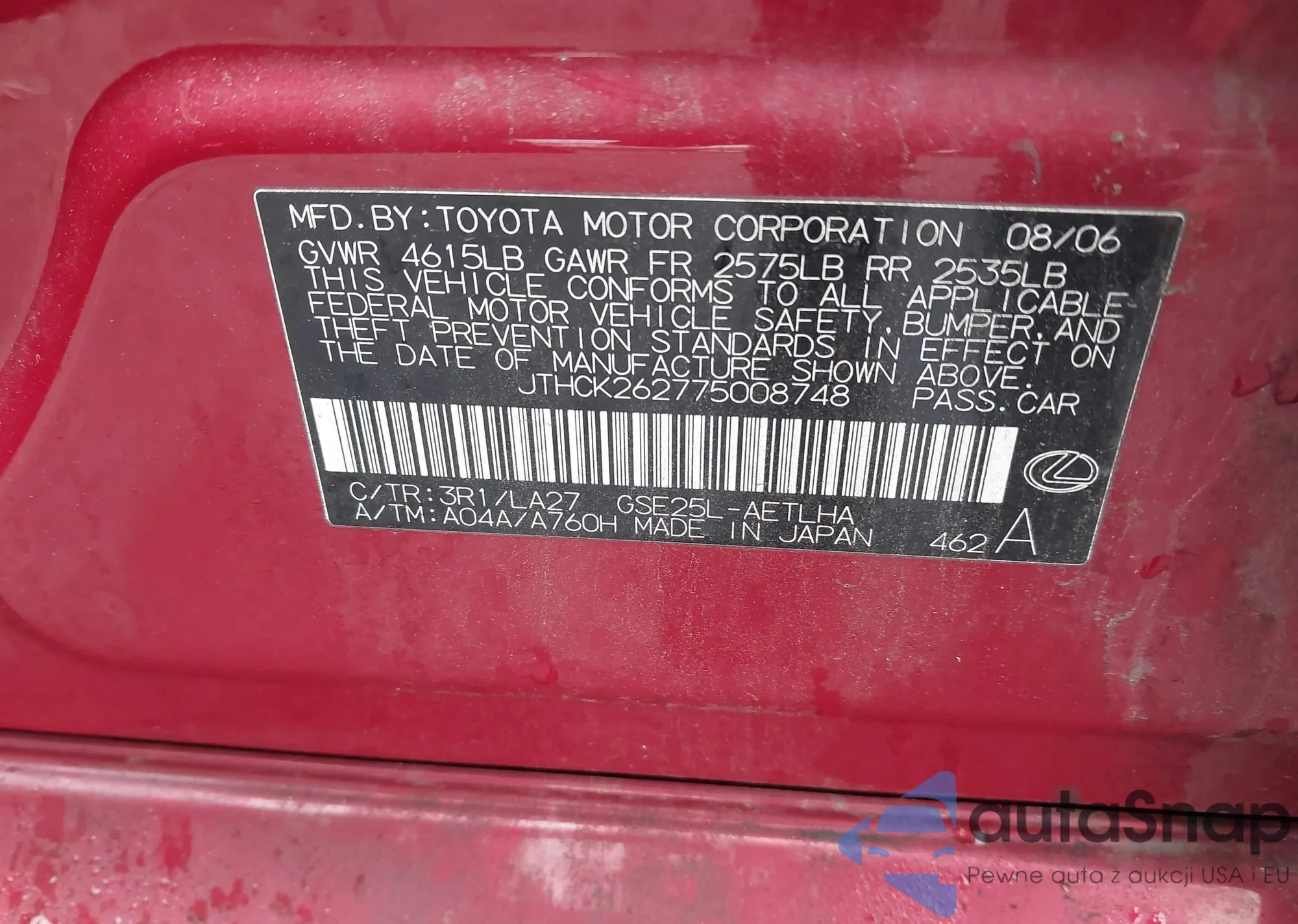 LOT: 43792535 VIN: JTHCK262775008748