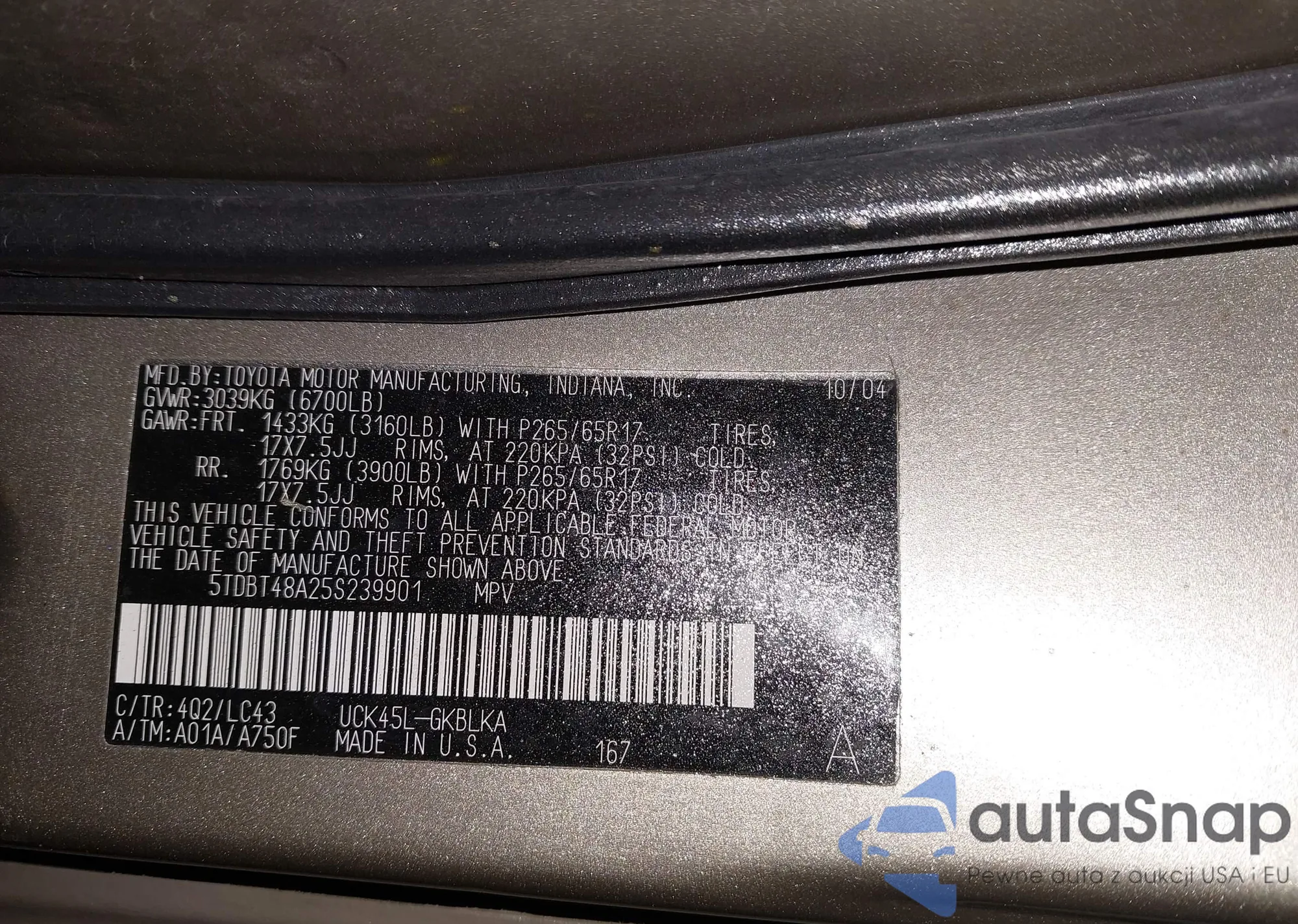 LOT: 43810291 VIN: 5TDBT48A25S239901