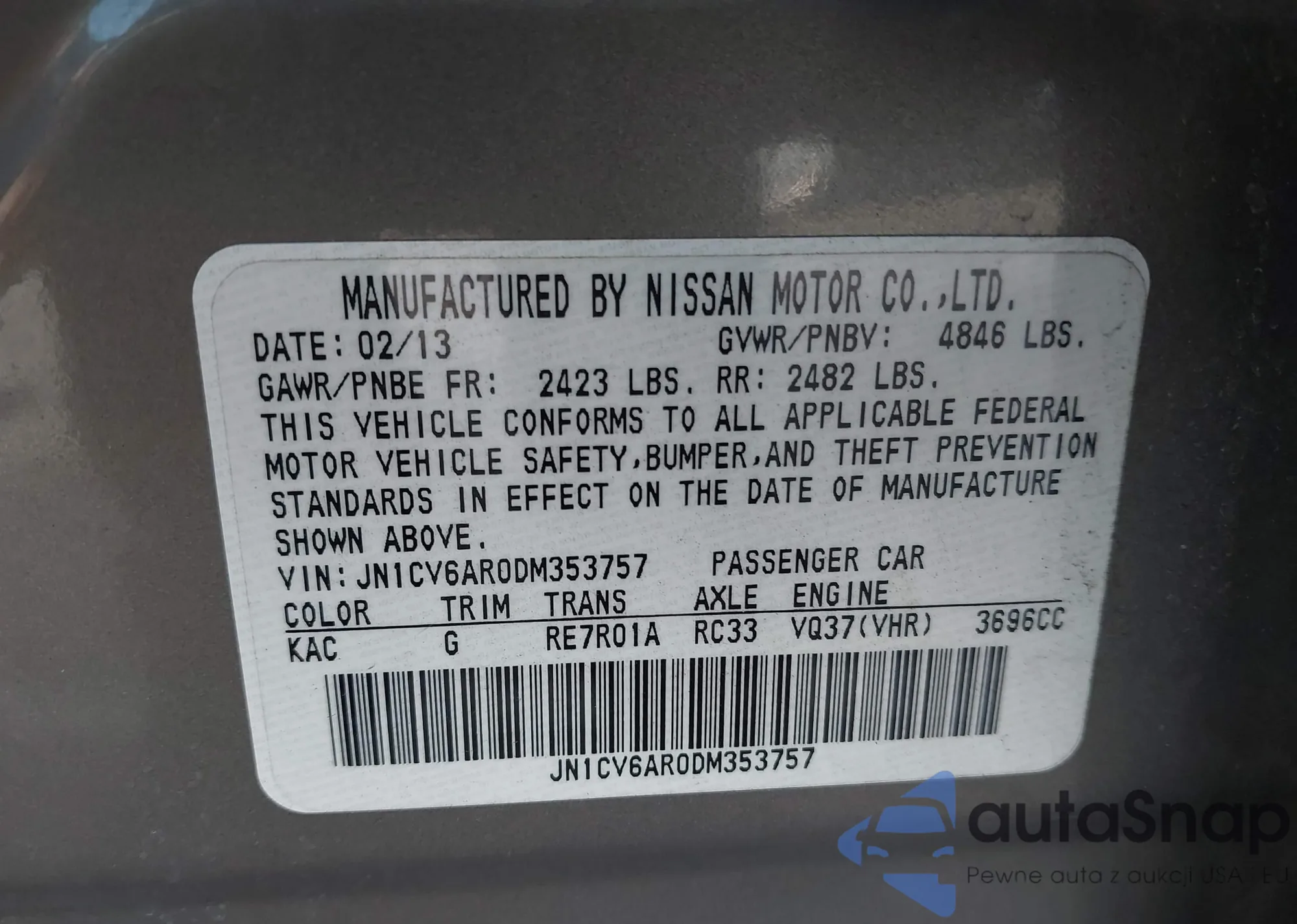 LOT: 43753943 VIN: JN1CV6AR0DM353757