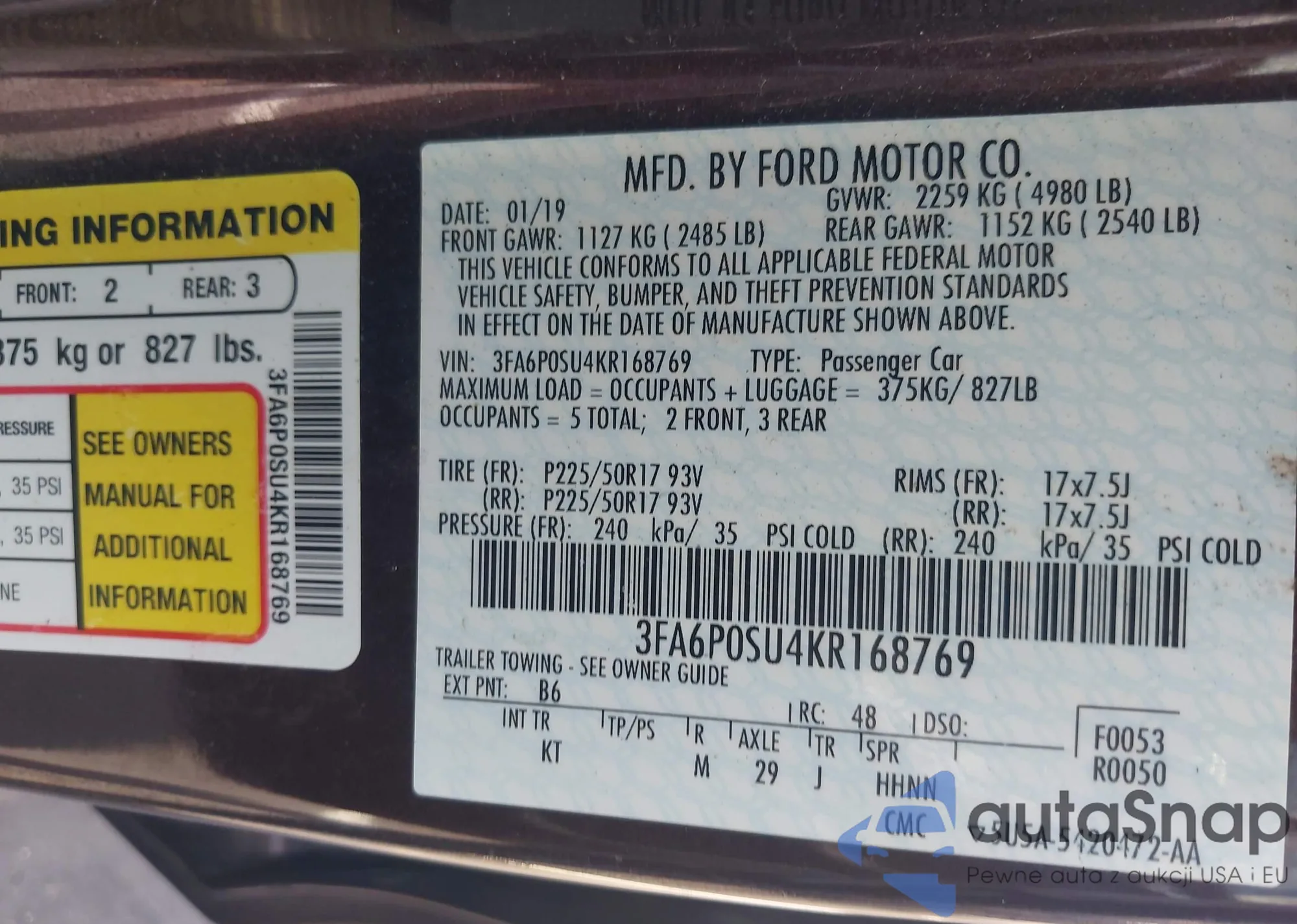 • VIN 3FA6P0SU4KR168769