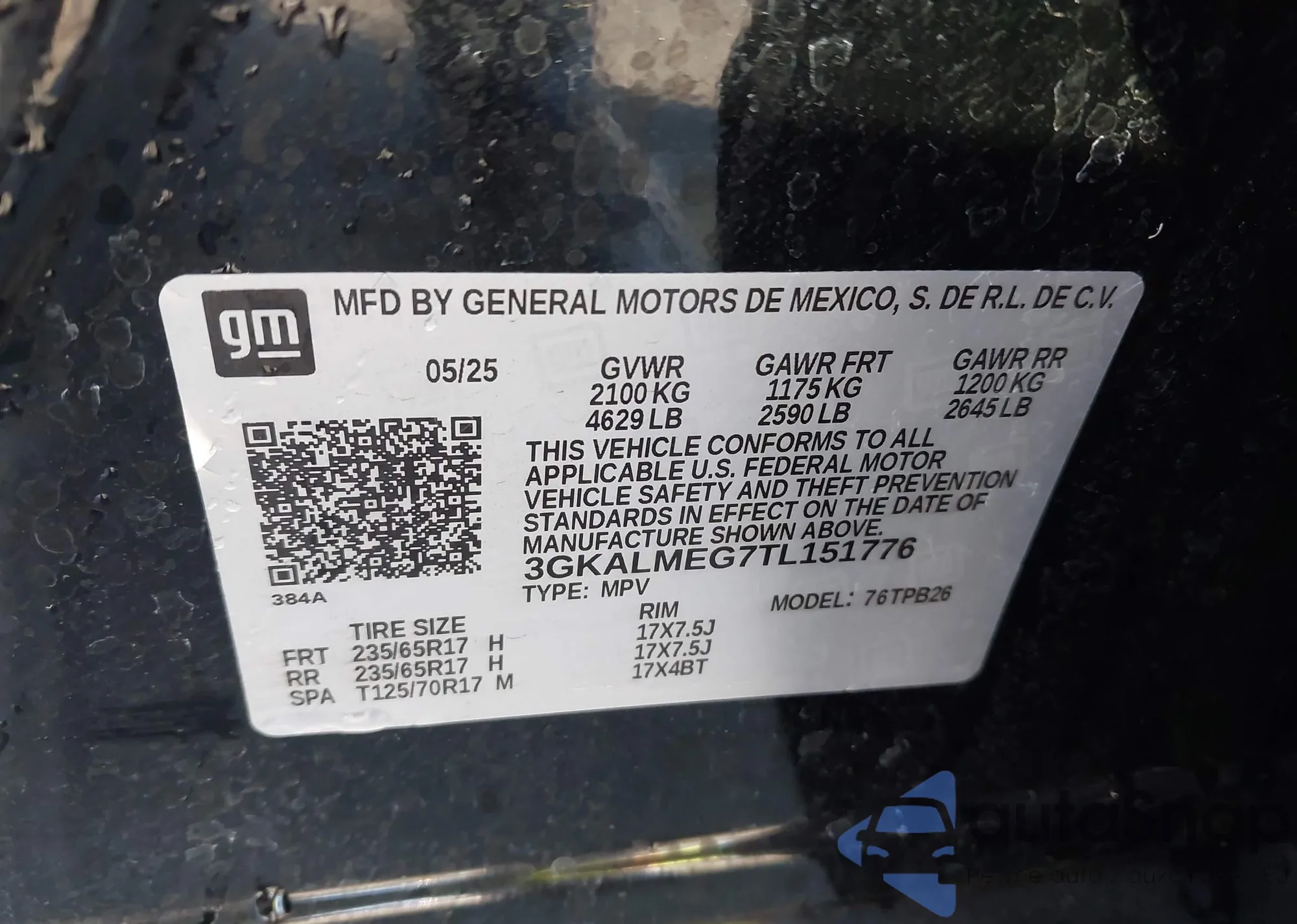LOT: 43444004 VIN: 3GKALMEG7TL151776