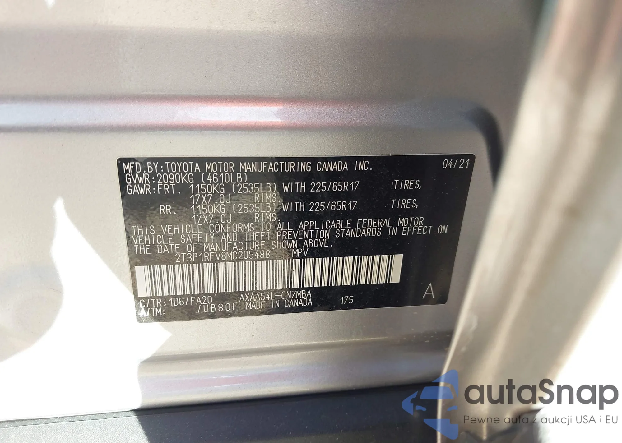 LOT: 43676620 VIN: 2T3P1RFV8MC205488