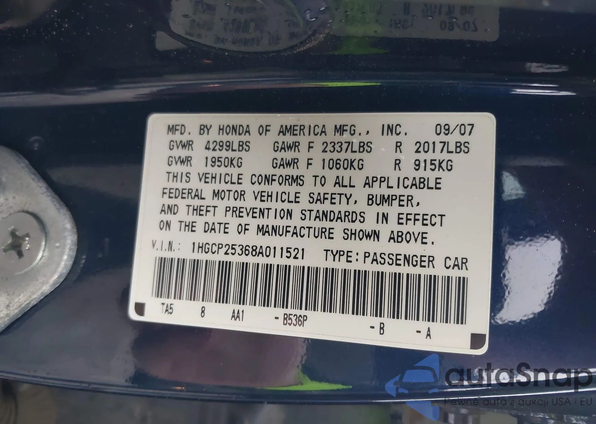 LOT: 43456032 VIN: 1HGCP25368A011521