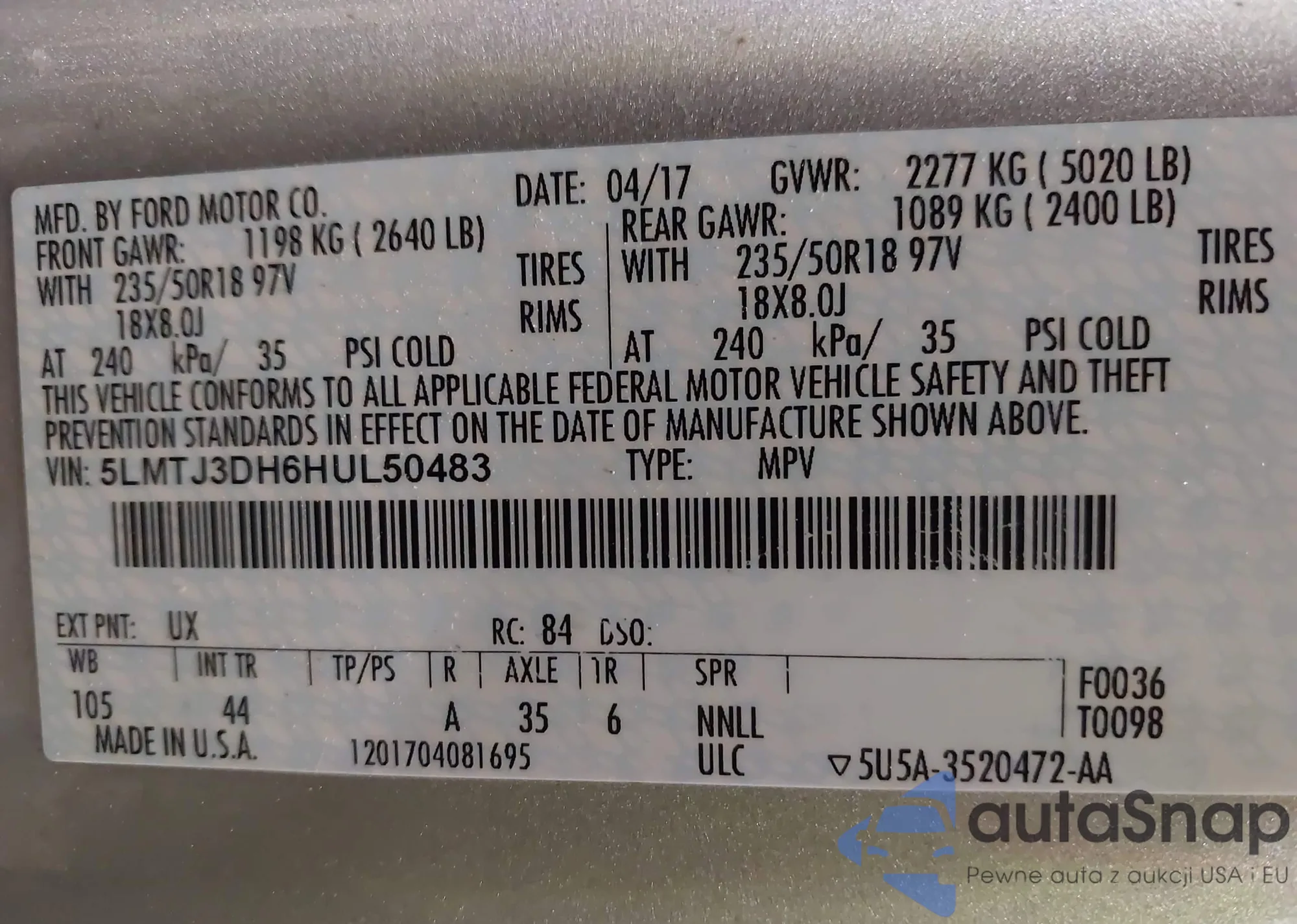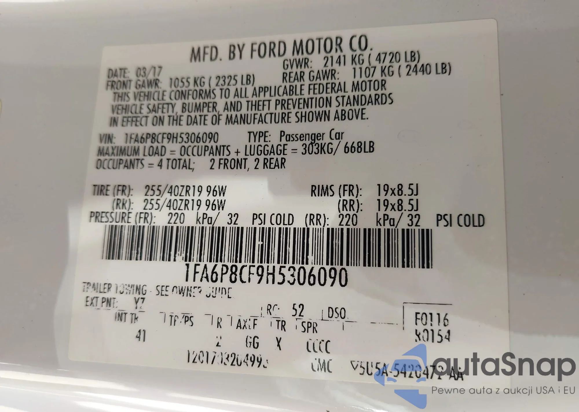 LOT: 43963889 VIN: 1FA6P8CF9H5306090