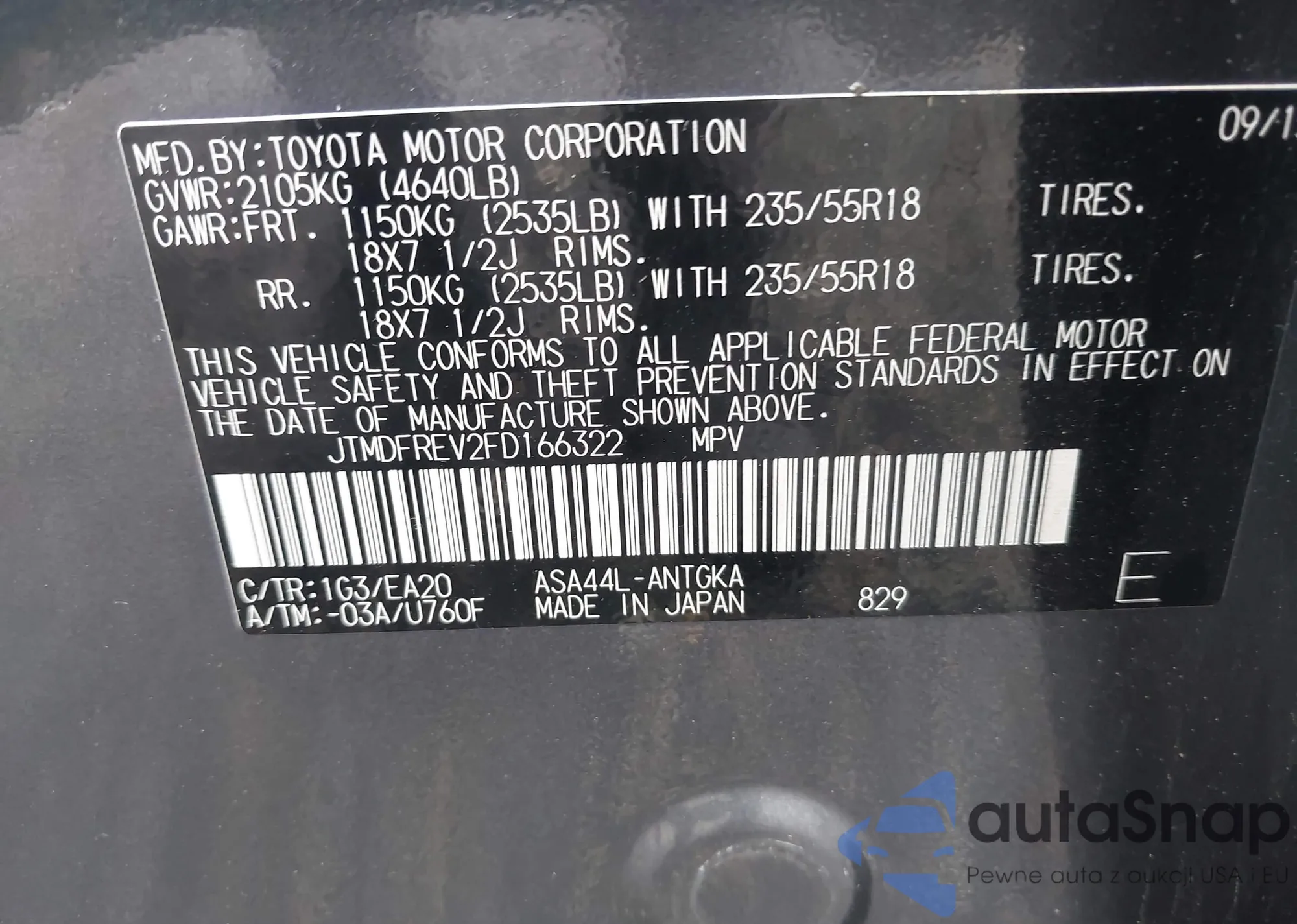 LOT: 43213908 VIN: JTMDFREV2FD166322