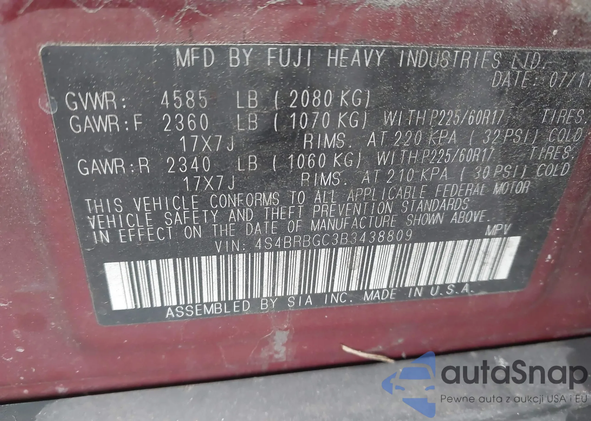 LOT: 43871911 VIN: 4S4BRBGC3B3438809