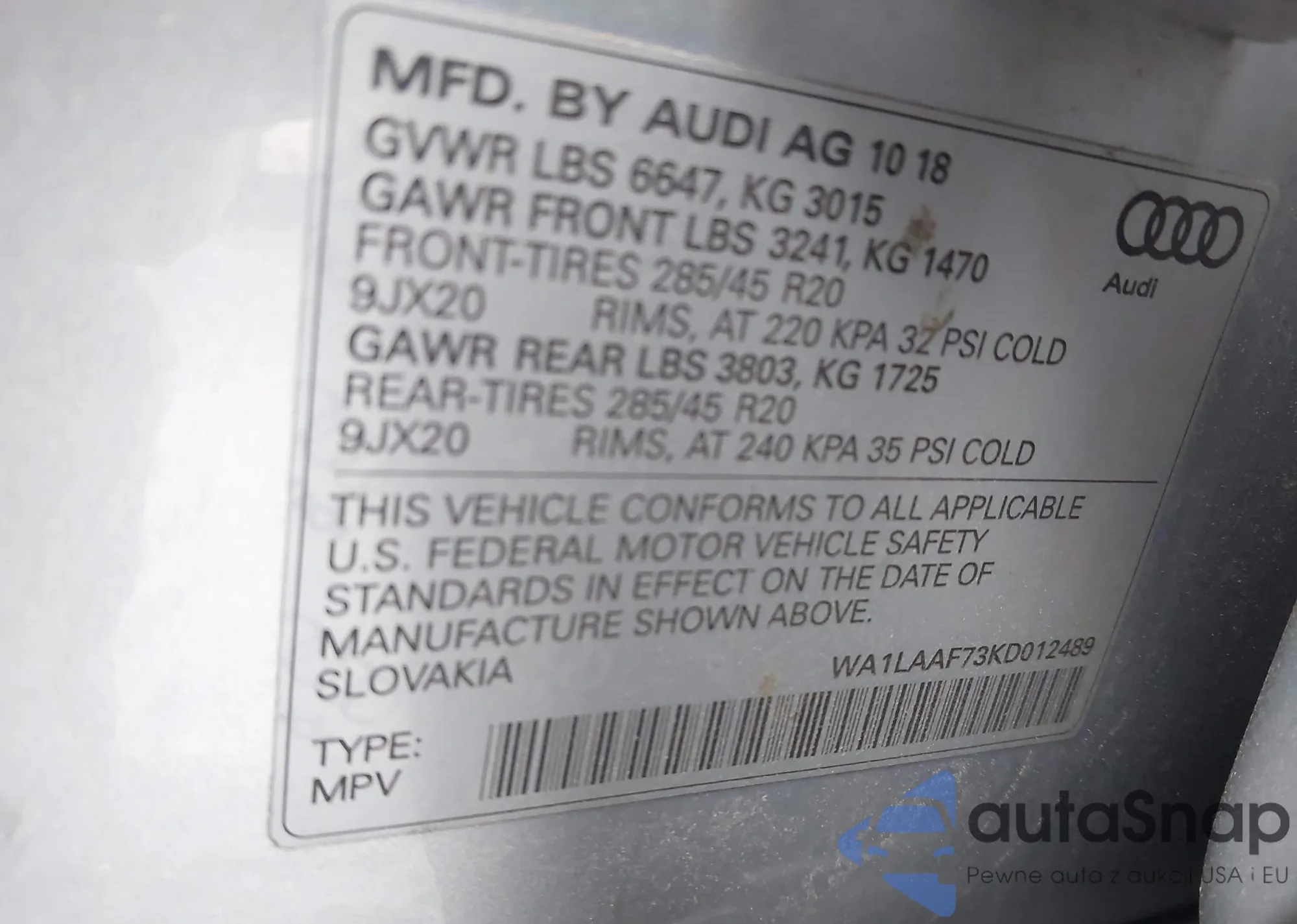 LOT: 43854136 VIN: WA1LAAF73KD012489