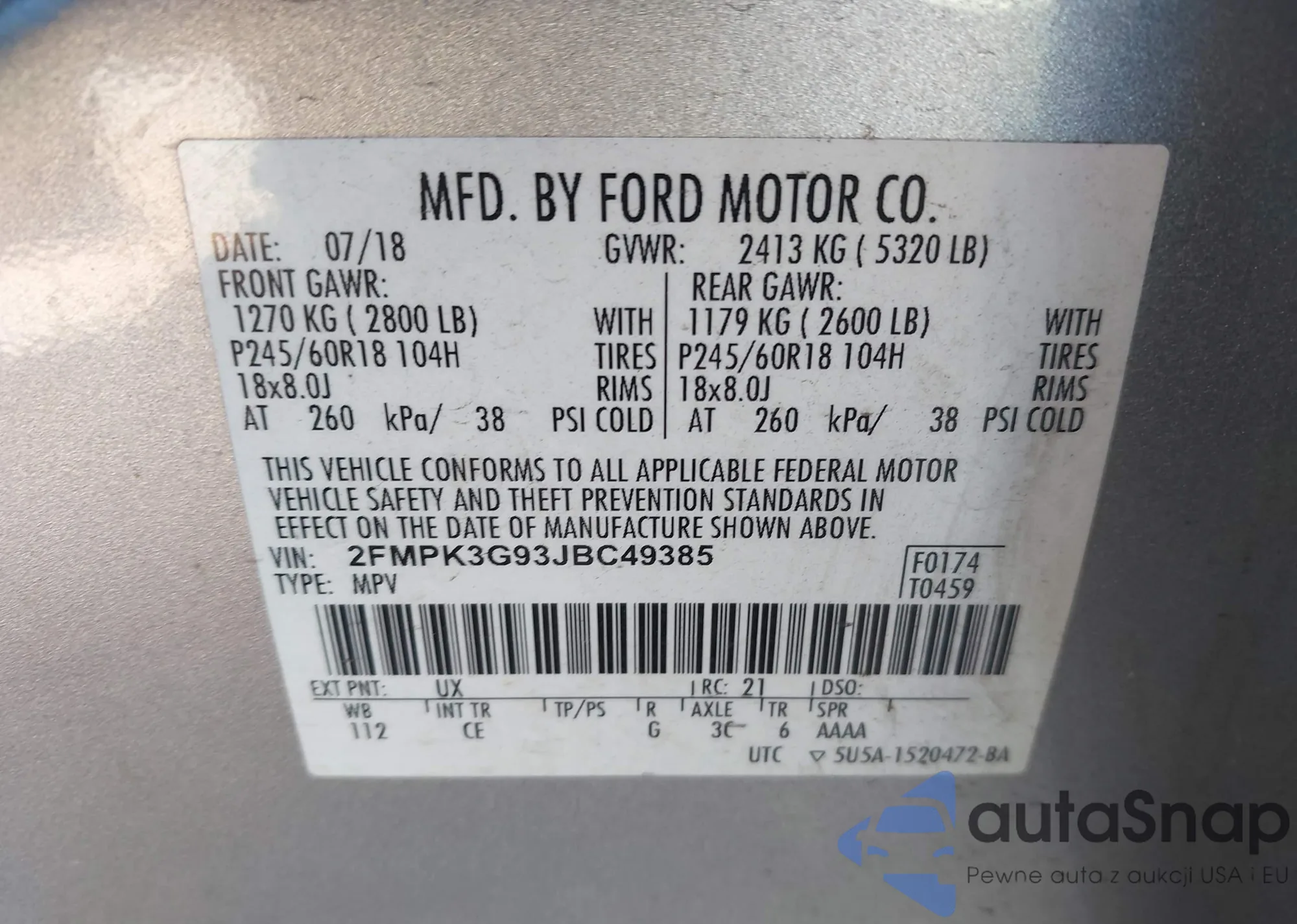 LOT: 43709024 VIN: 2FMPK3G93JBC49385