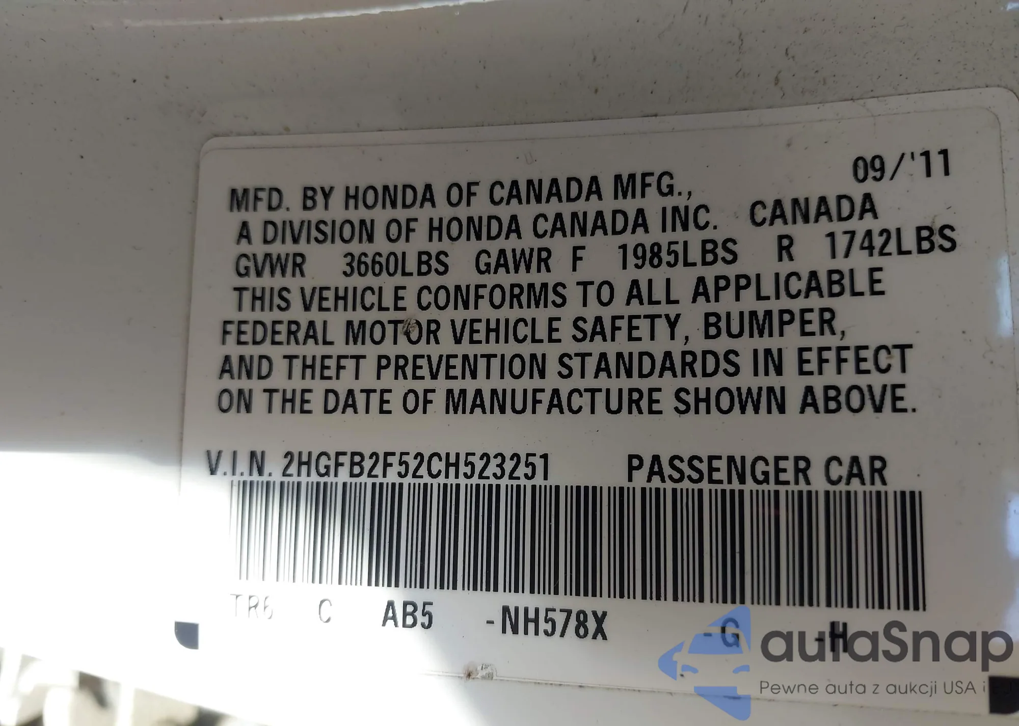 • VIN 2HGFB2F52CH523251