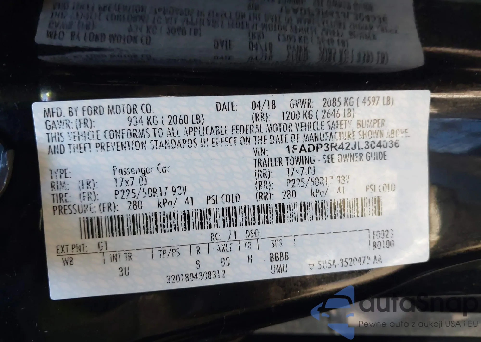 LOT: 43438056 VIN: 1FADP3R42JL304036