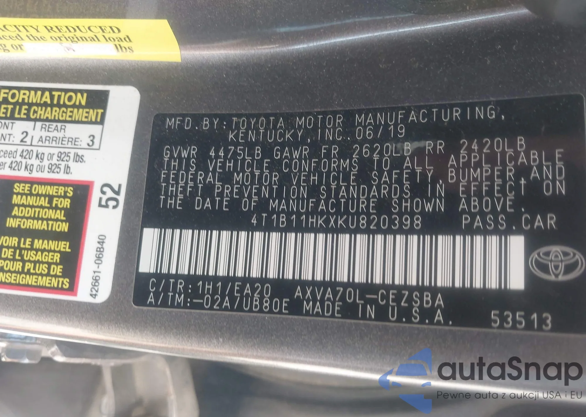• VIN 4T1B11HKXKU820398