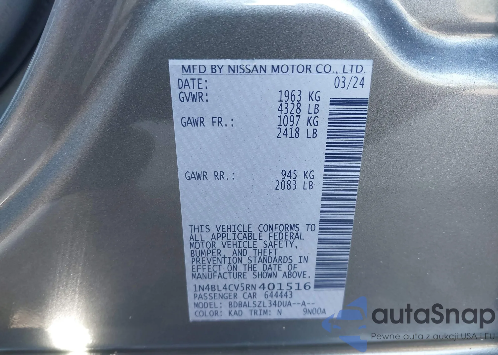 LOT: 43482604 VIN: 1N4BL4CV5RN401516