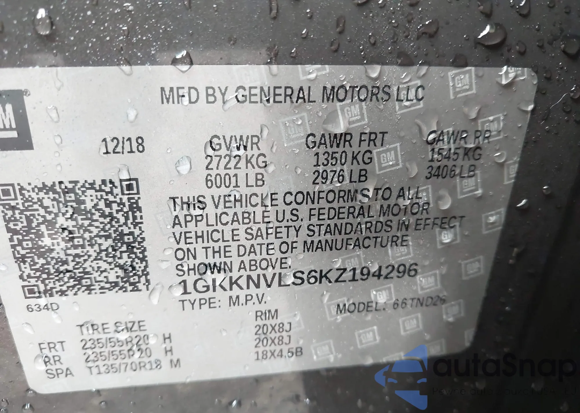 LOT: 43728285 VIN: 1GKKNVLS6KZ194296
