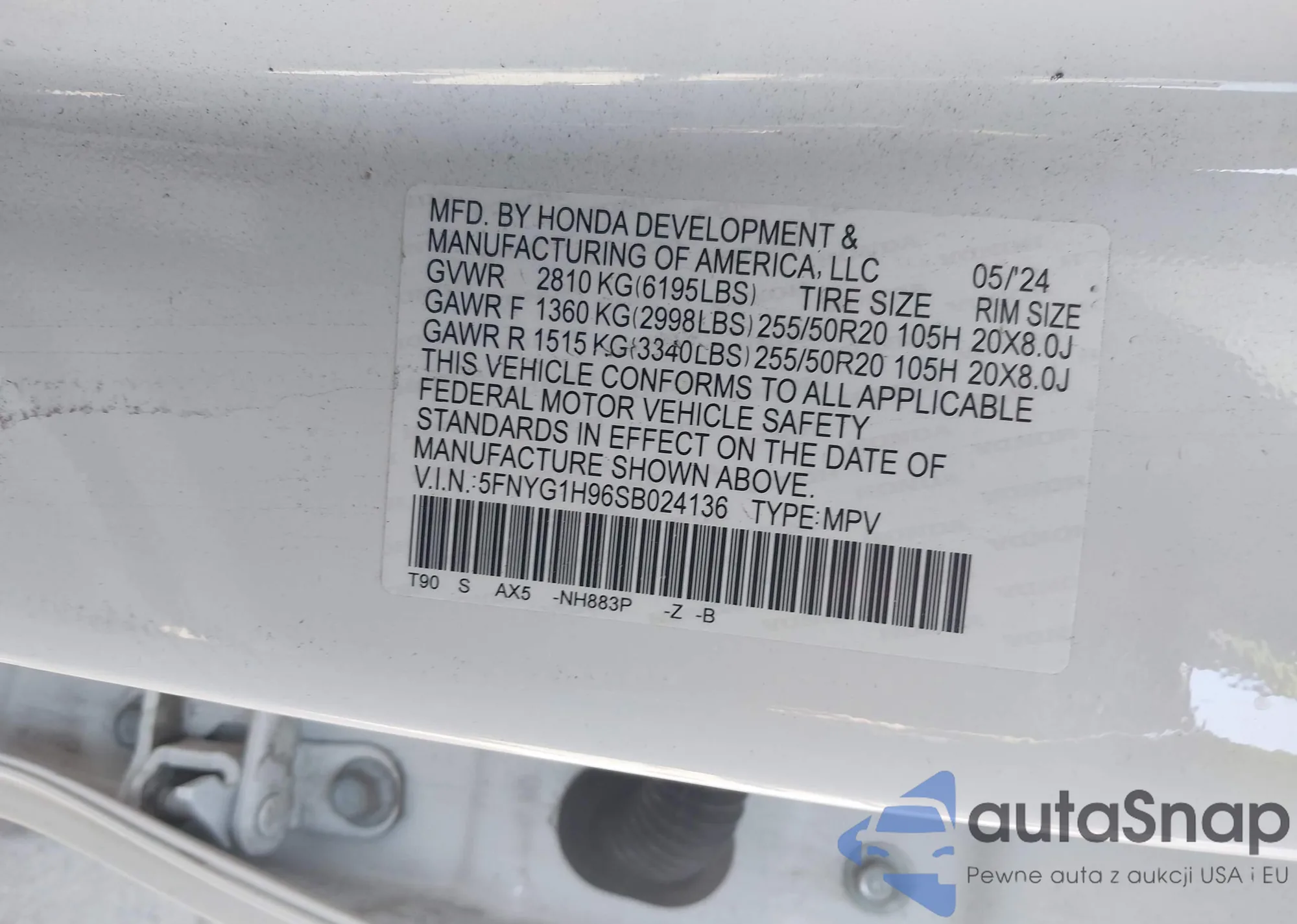 LOT: 43359444 VIN: 5FNYG1H96SB024136