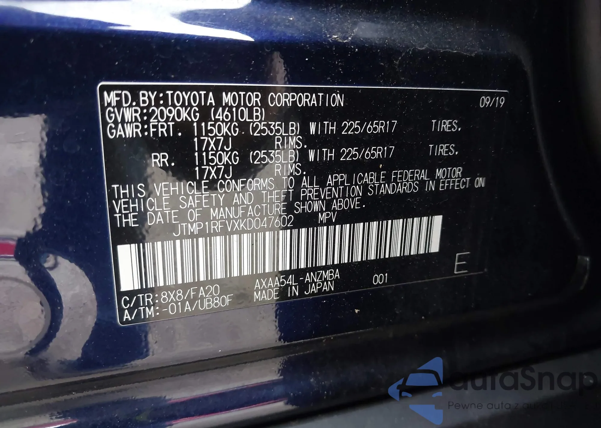 LOT: 43615687 VIN: JTMP1RFVXKD047602