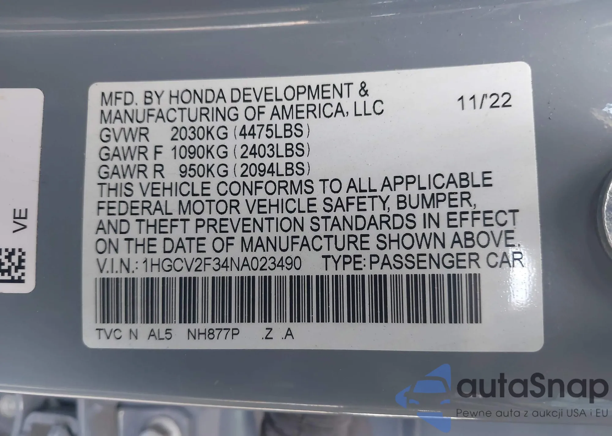 LOT: 43494832 VIN: 1HGCV2F34NA023490