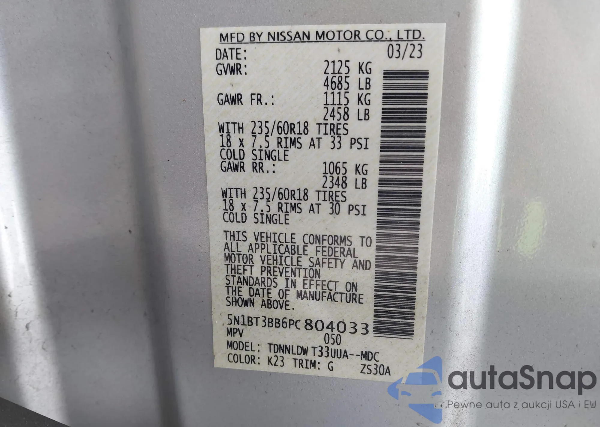 LOT: 43559440 VIN: 5N1BT3BB6PC804033