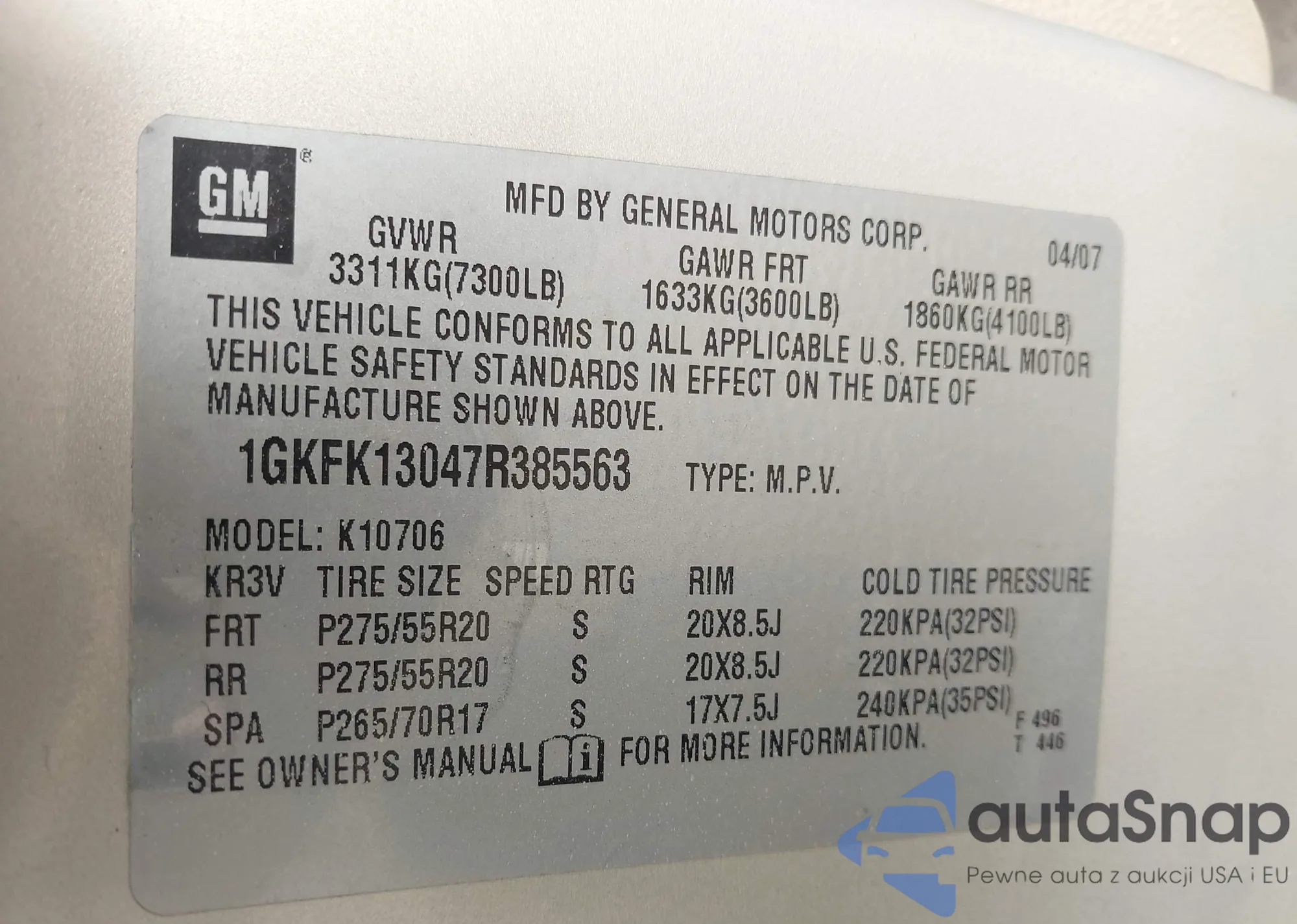 LOT: 43847485 VIN: 1GKFK13047R385563