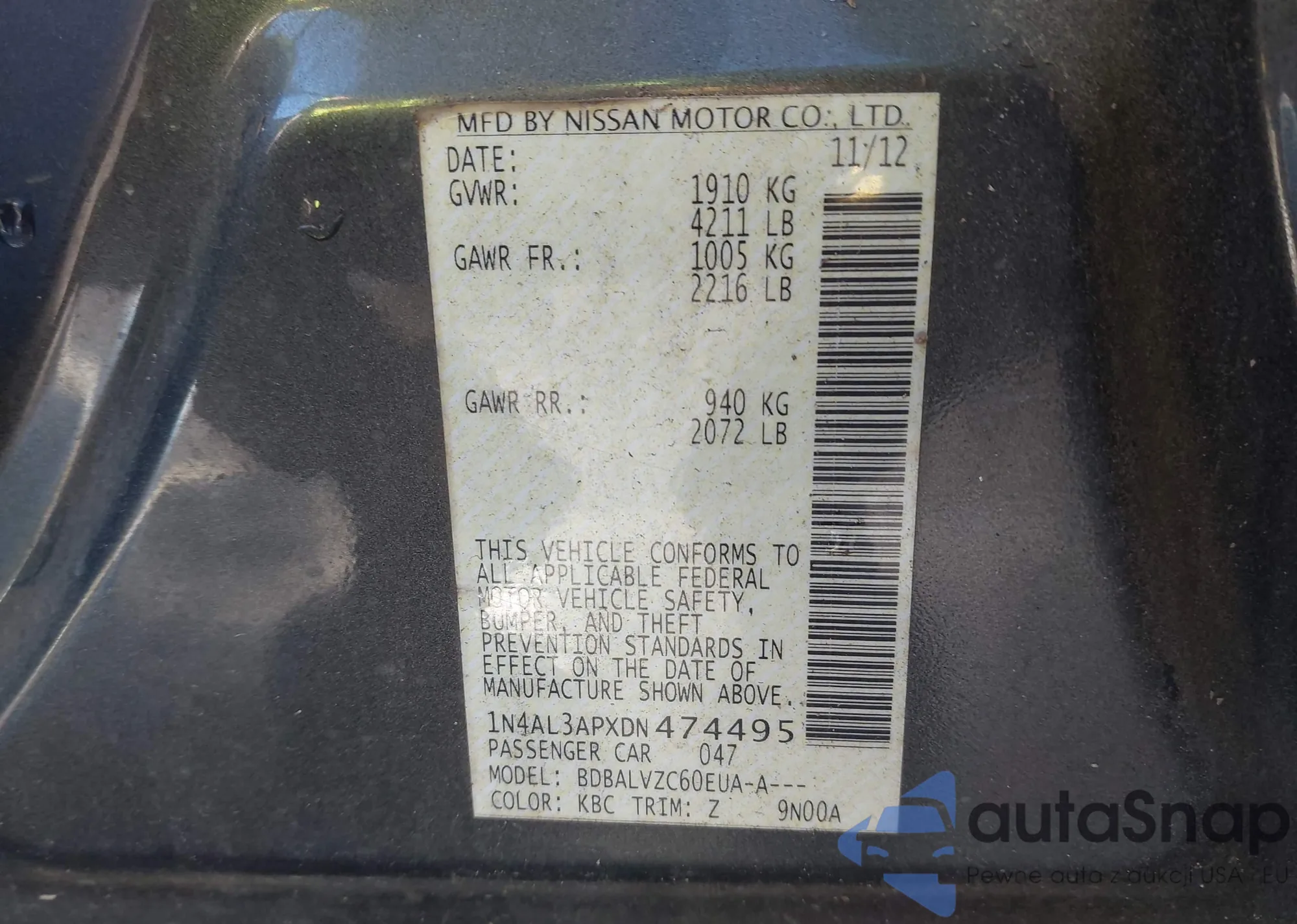 LOT: 43776103 VIN: 1N4AL3APXDN474495