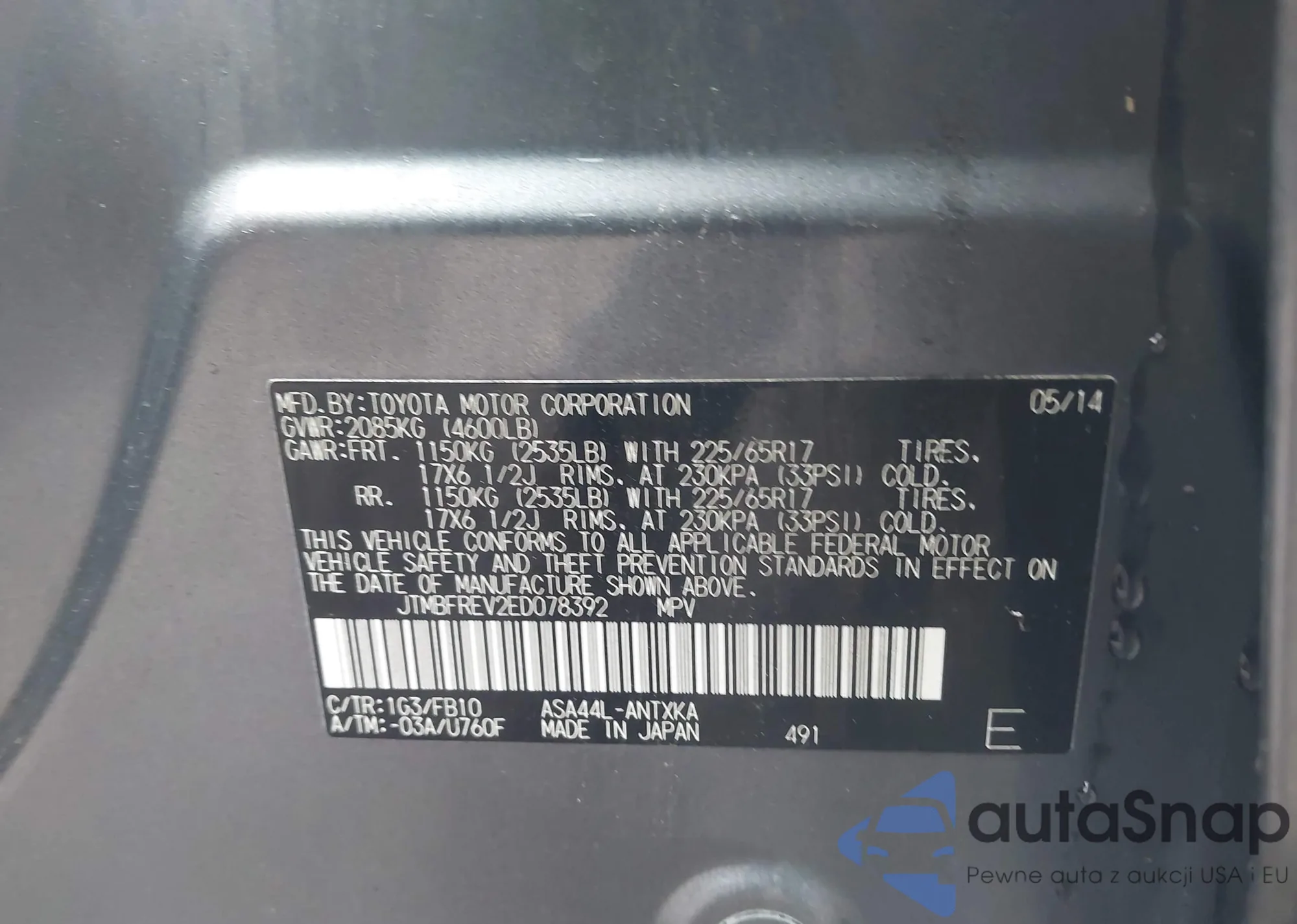 LOT: 43778700 VIN: JTMBFREV2ED078392