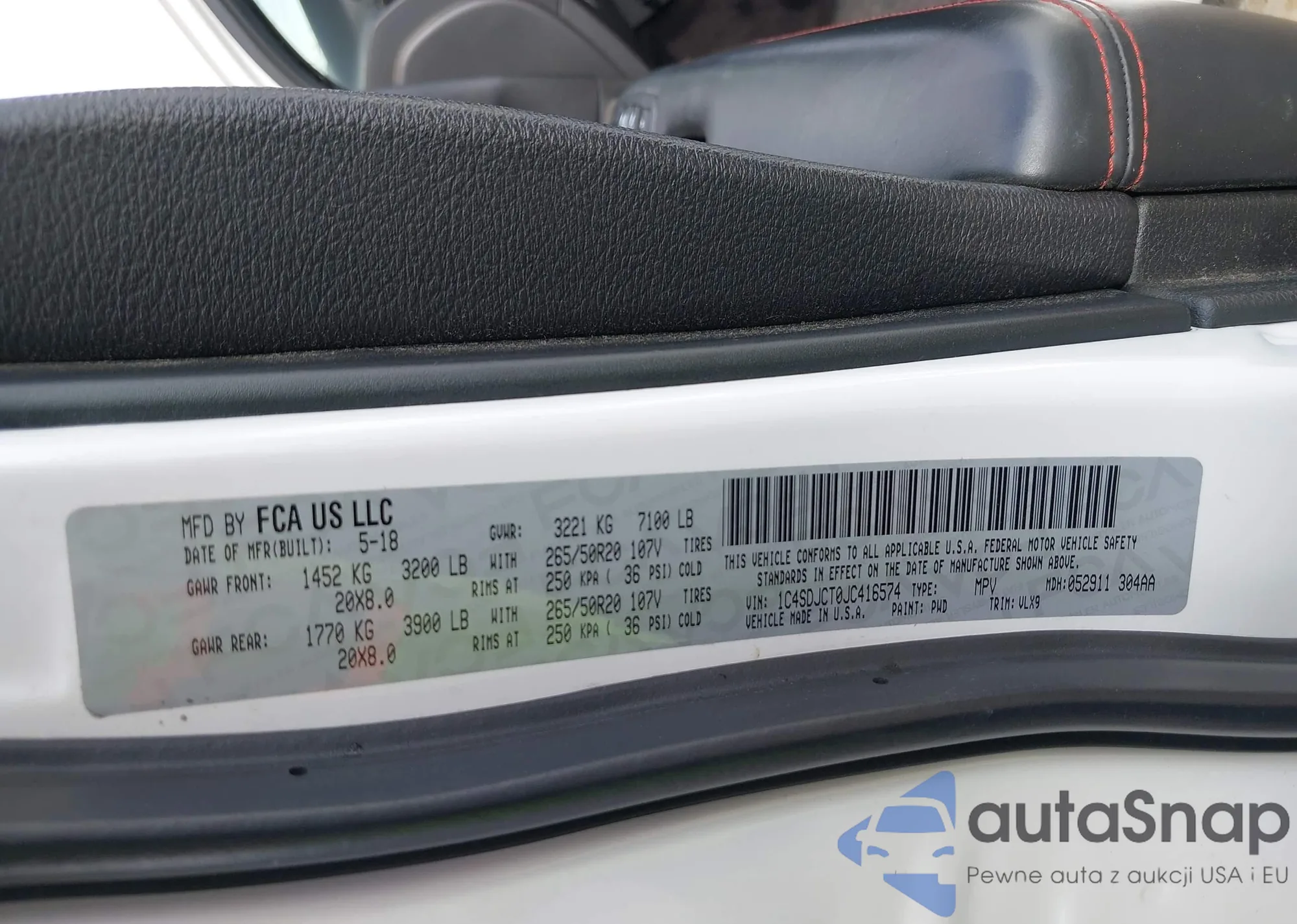 LOT: 43316987 VIN: 1C4SDJCT0JC416574