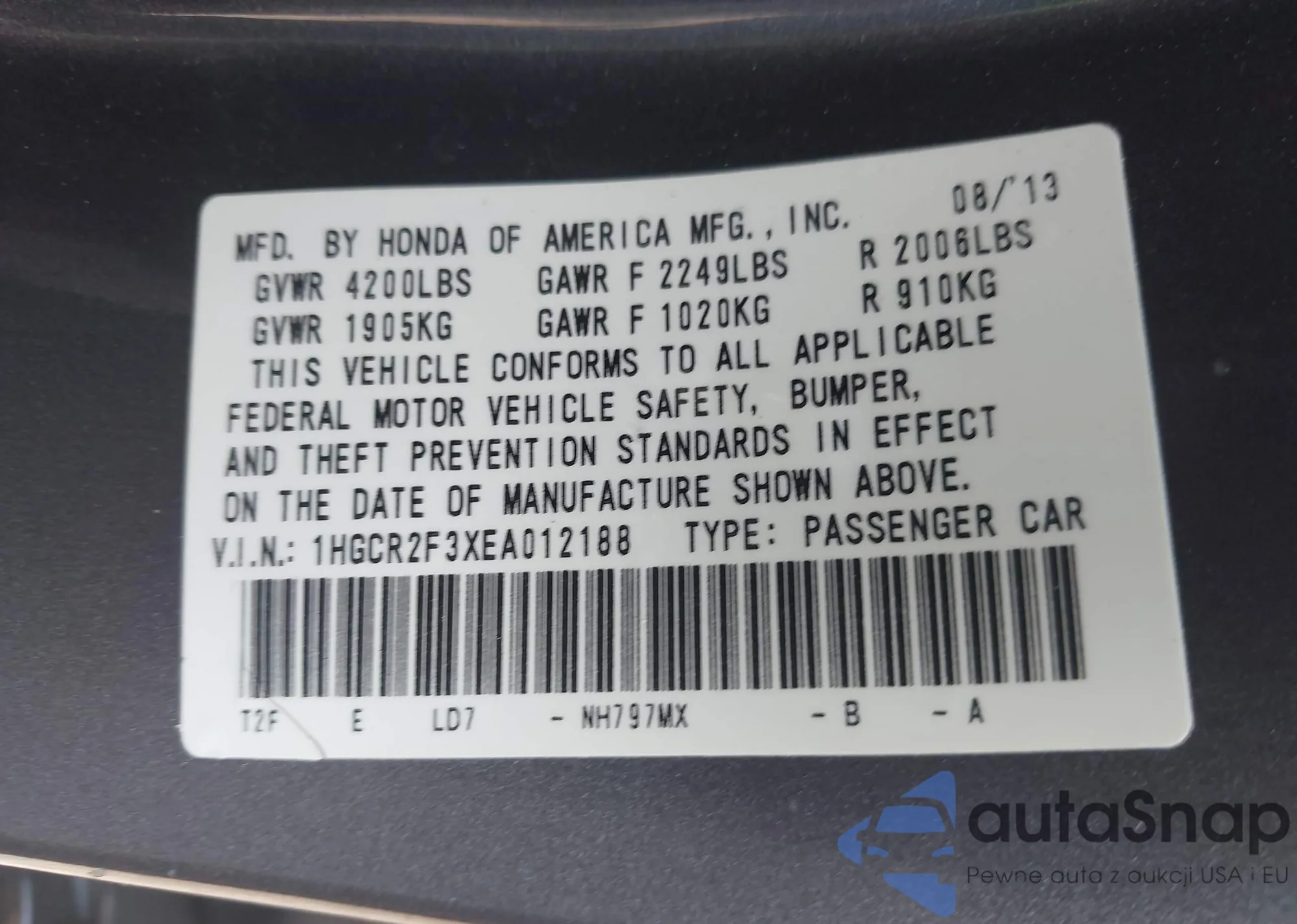 LOT: 43116243 VIN: 1HGCR2F3XEA012188