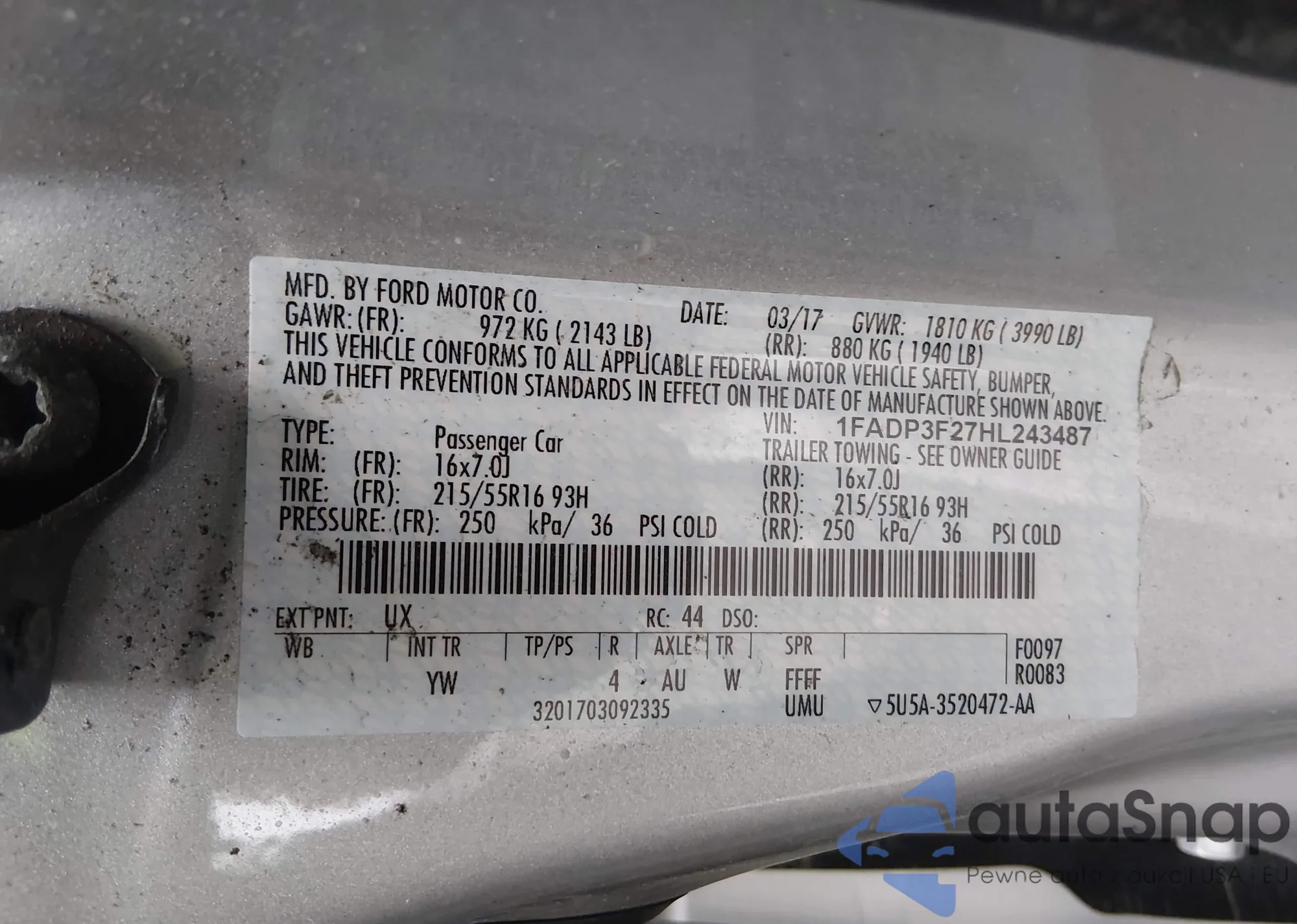 • VIN 1FADP3F27HL243487
