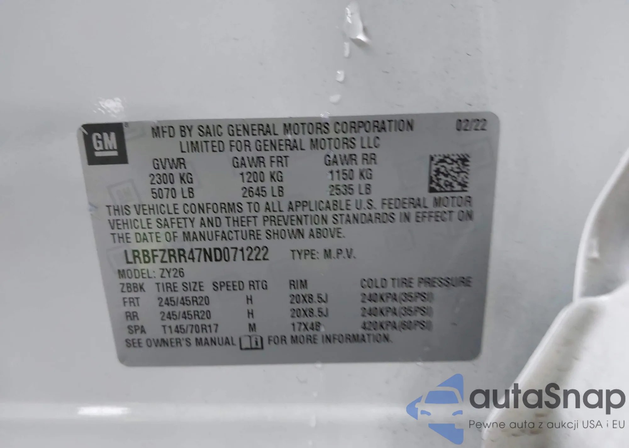 LOT: 43778813 VIN: LRBFZRR47ND071222