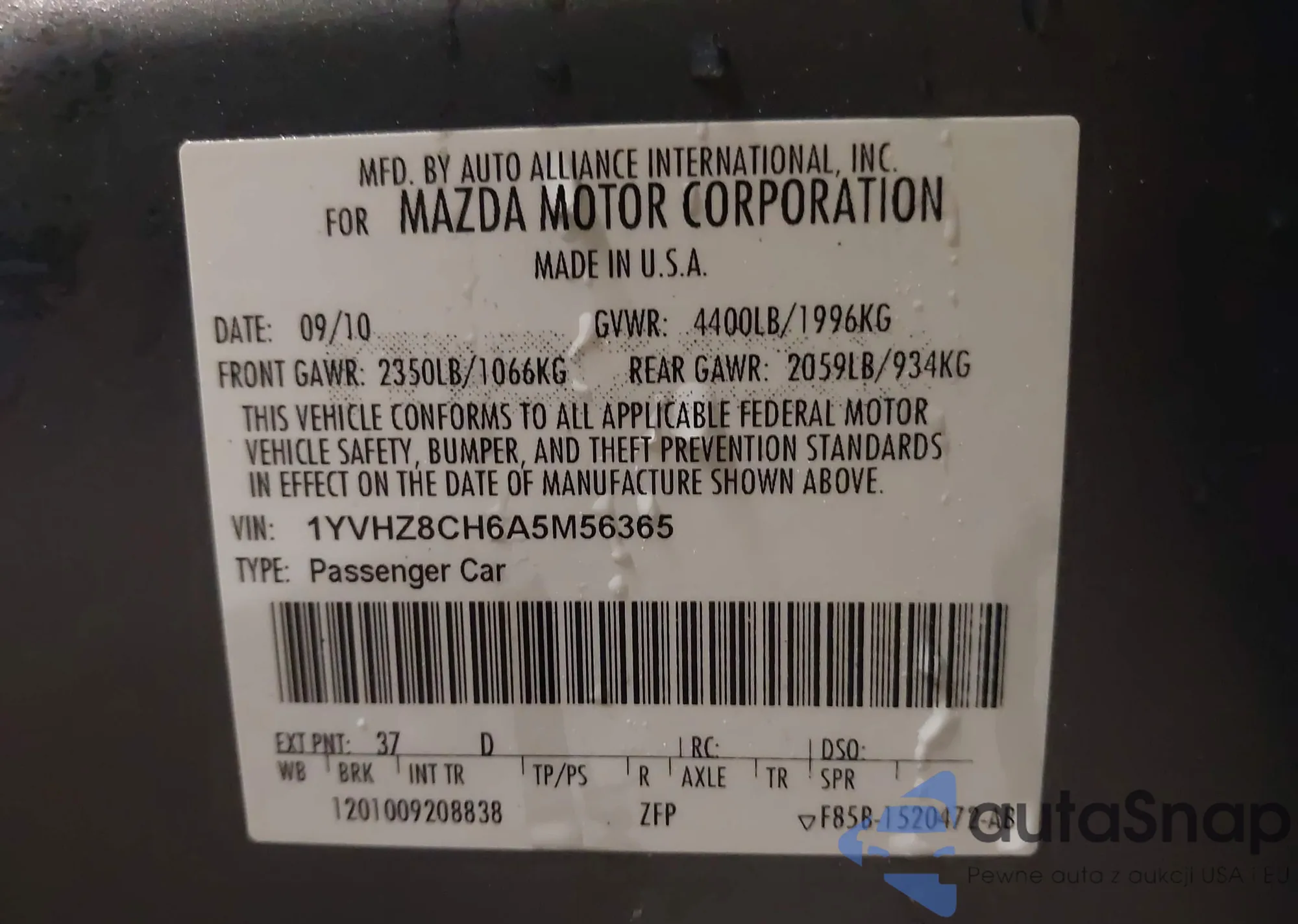 • VIN 1YVHZ8CH6A5M56365