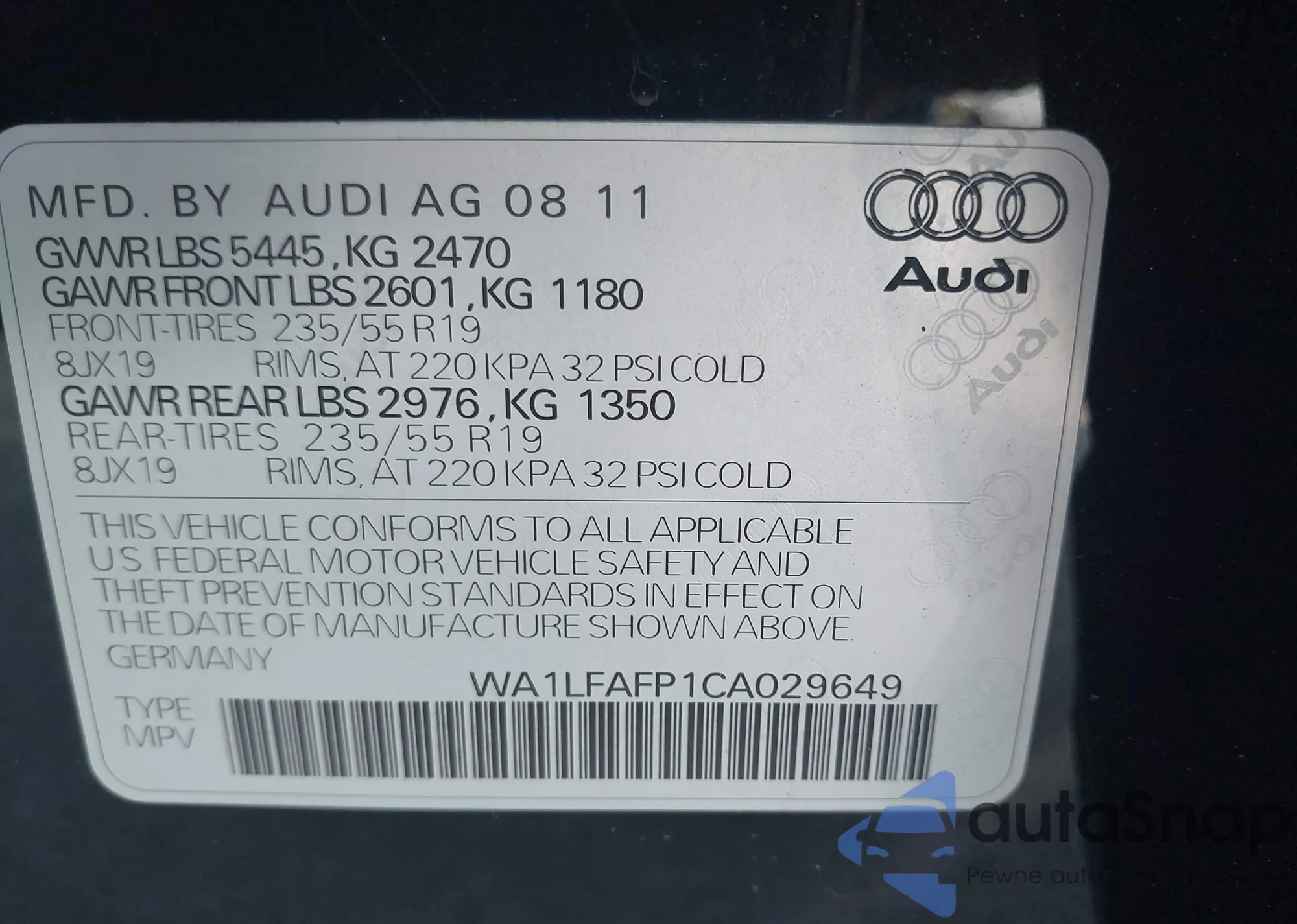 LOT: 43943385 VIN: WA1LFAFP1CA029649