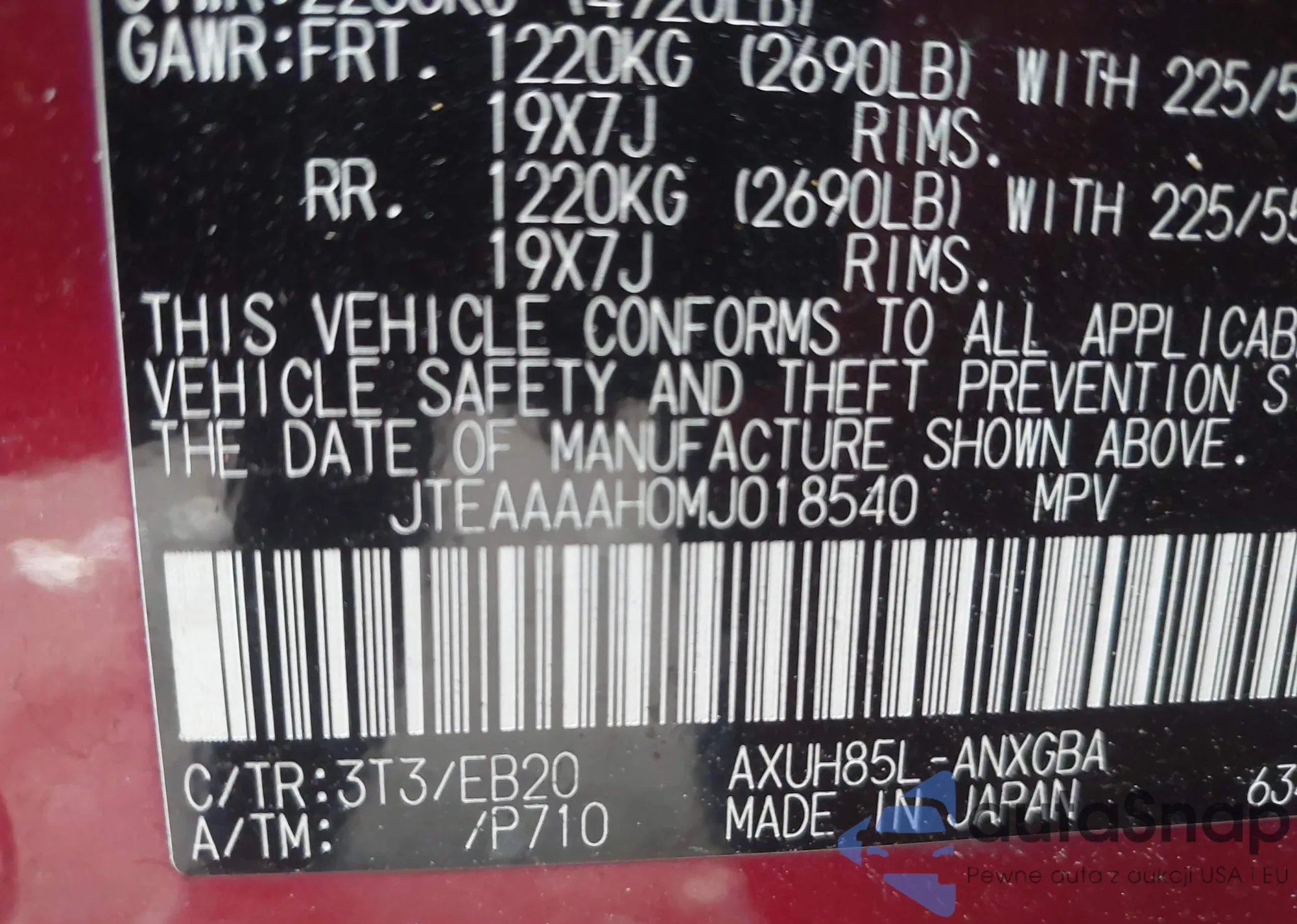 • VIN JTEAAAAH0MJ018540