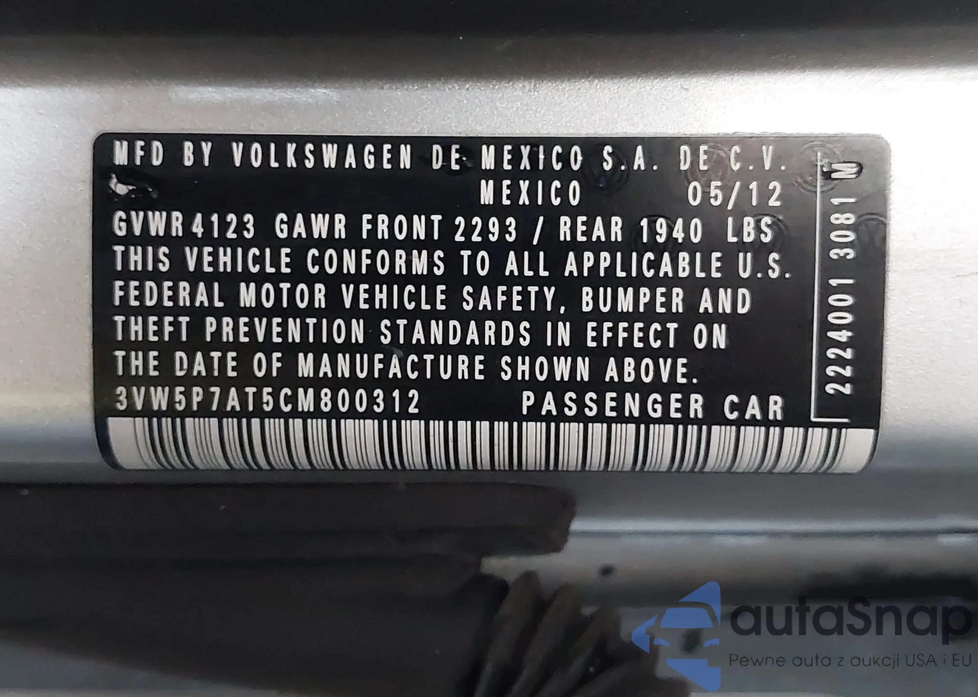 LOT: 43808006 VIN: 3VW5P7AT5CM800312