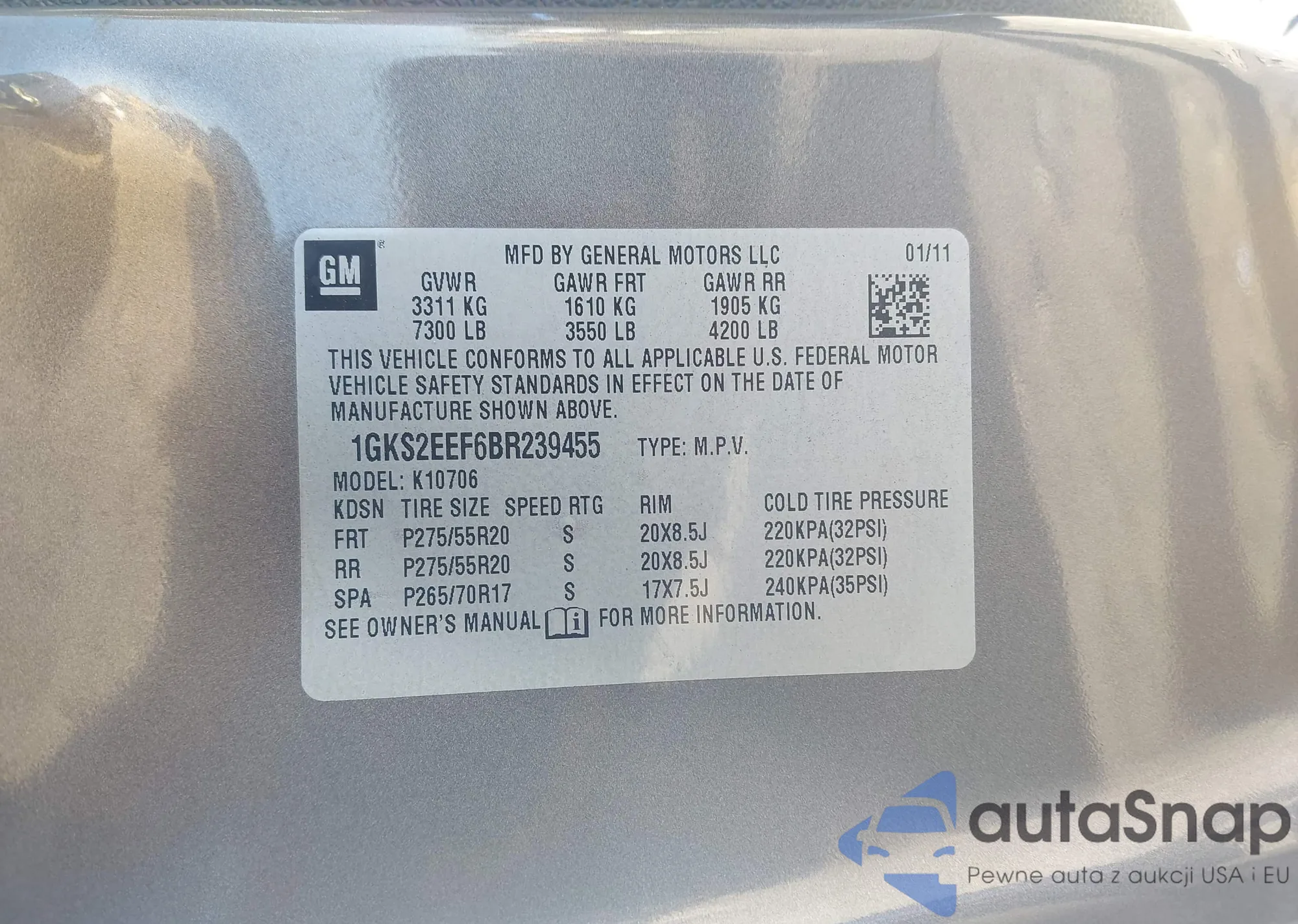 LOT: 43701820 VIN: 1GKS2EEF6BR239455