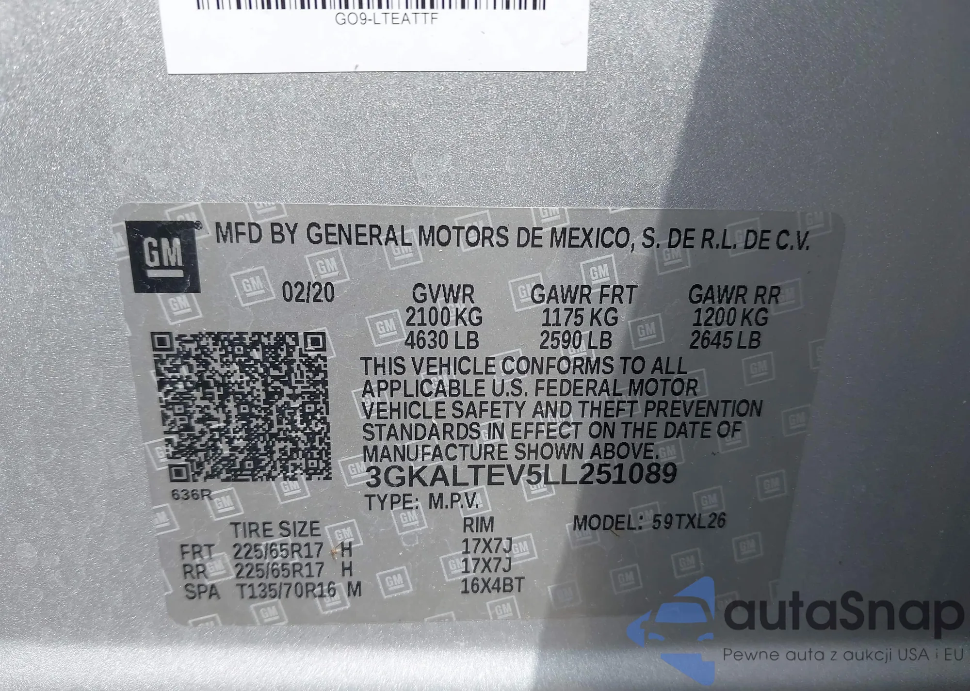 LOT: 42747850 VIN: 3GKALTEV5LL251089